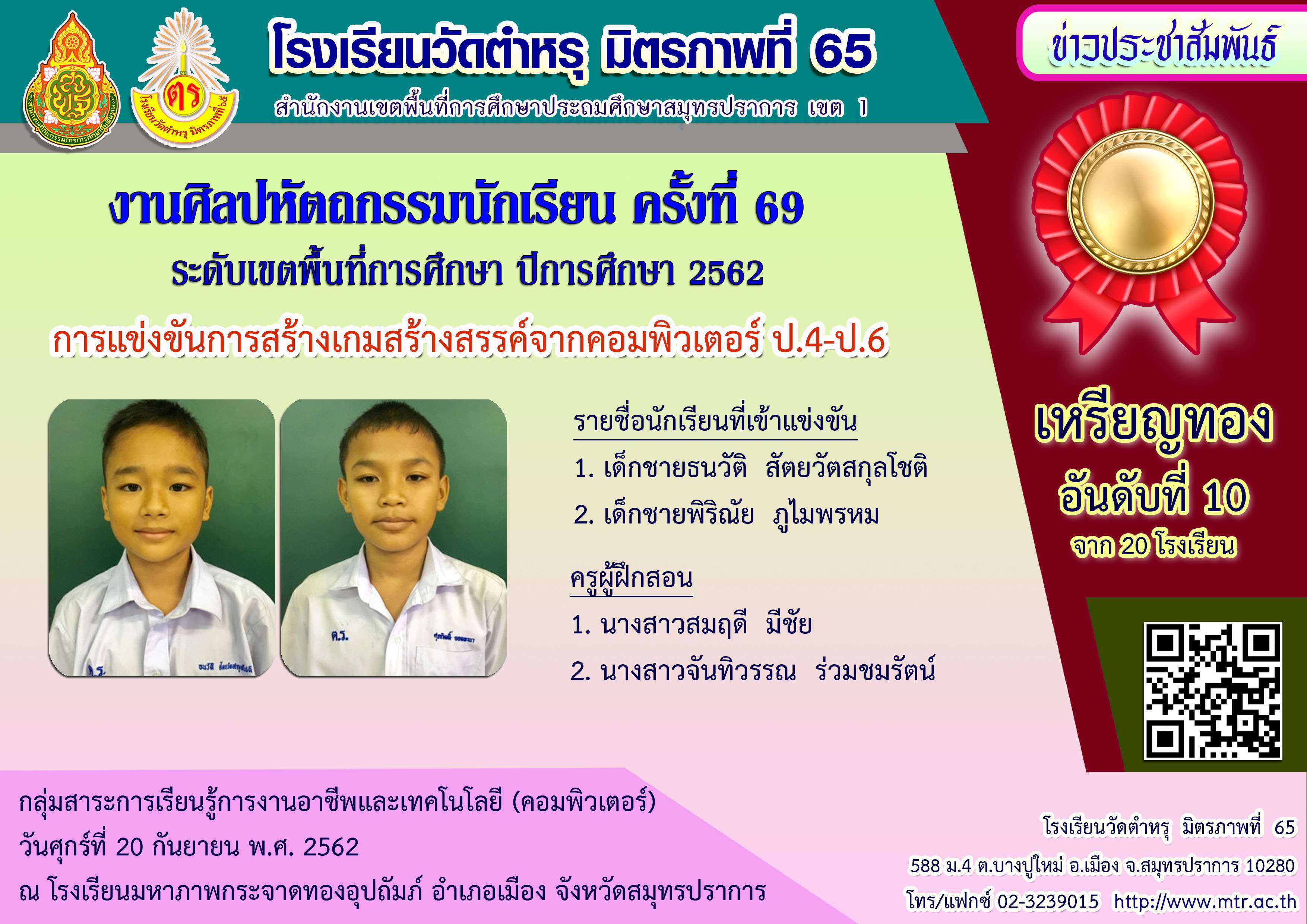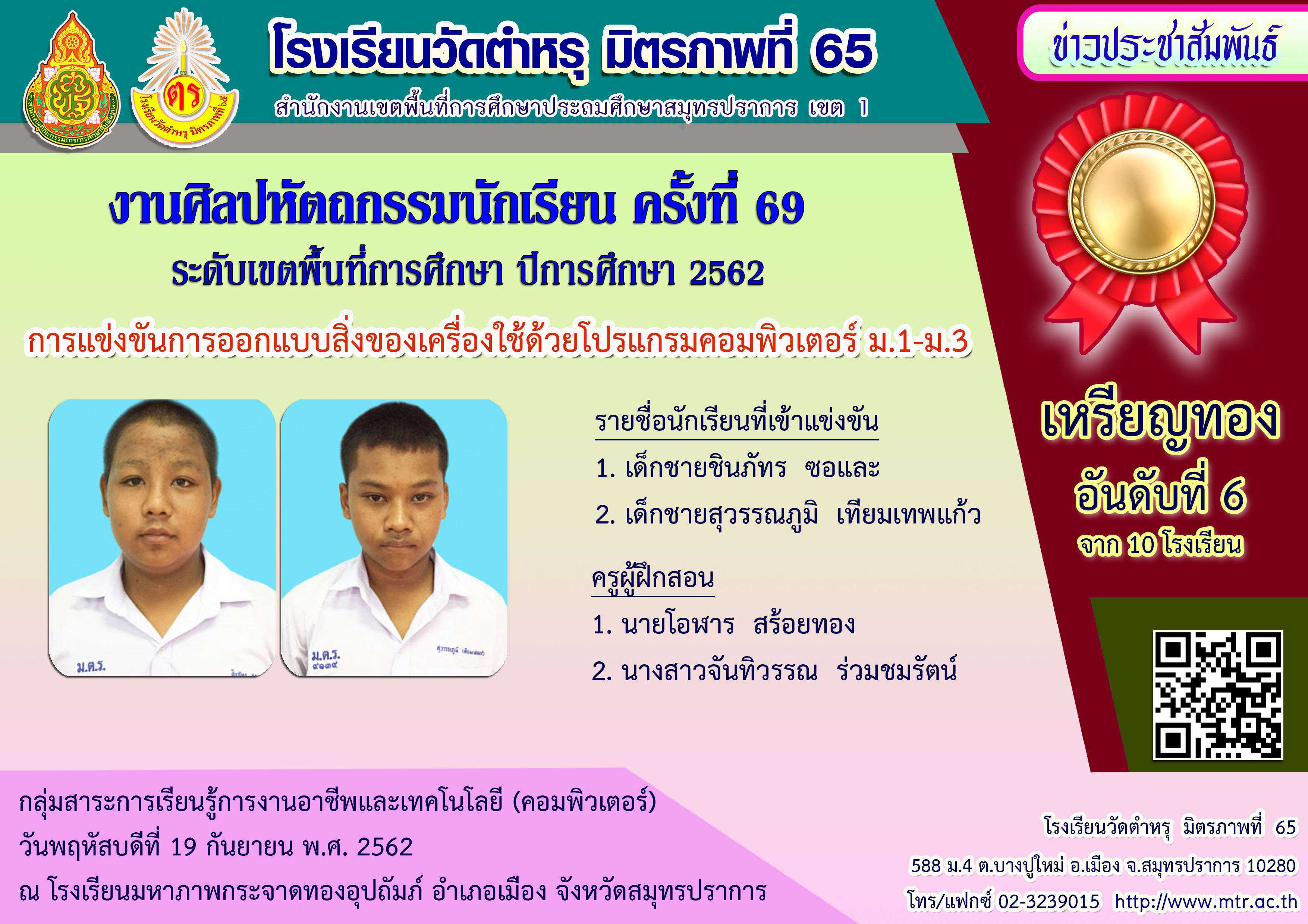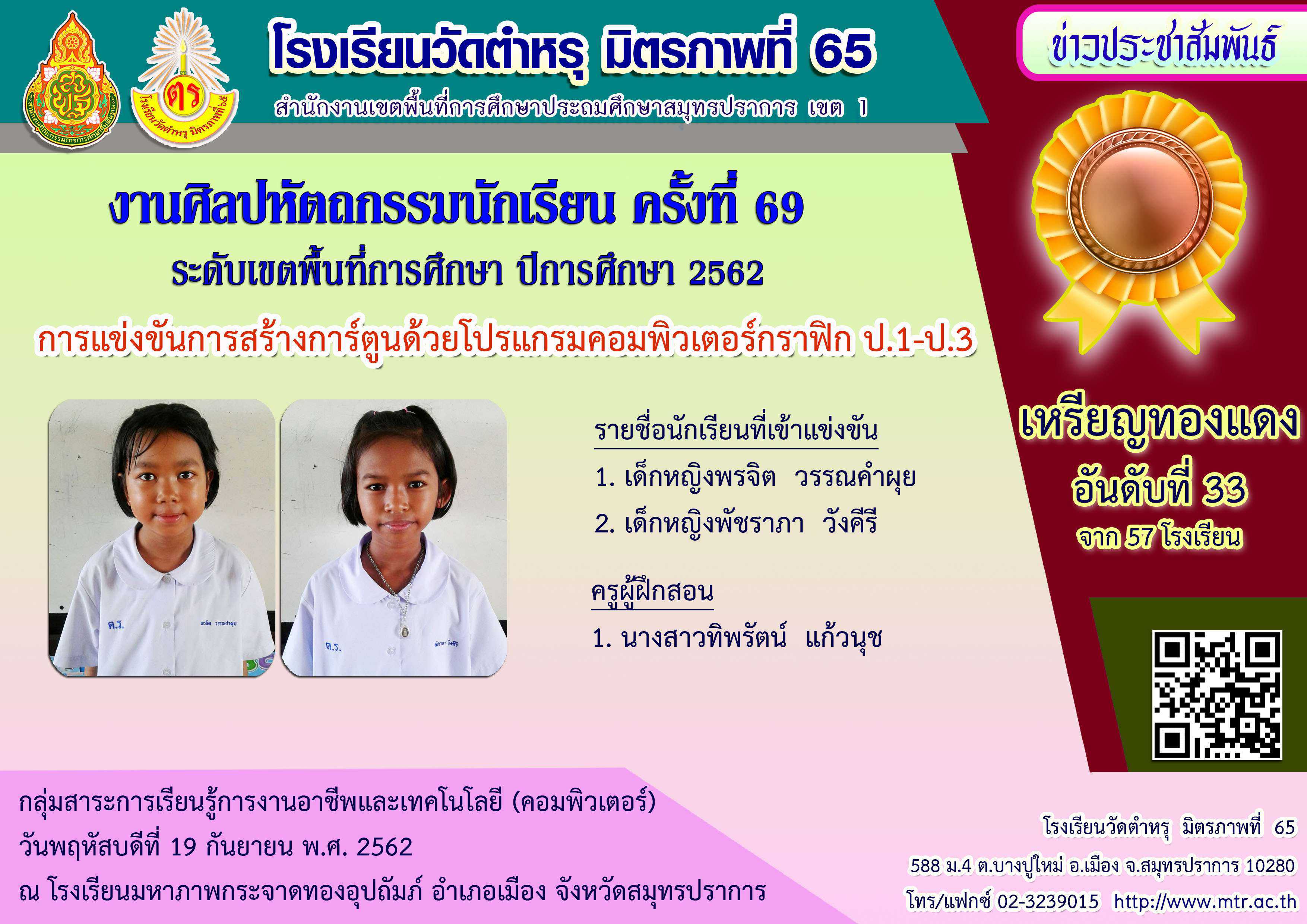 โรงเรียนวัดตำหรุ มิตรภาพที่ 65 ได้ส่งนักเรียนเข้าร่วมการแข่งขันในงานศิลปหัตถกรรมนักเรียน ครั้งที่ 69 ปีการศึกษา 2562 ระดับเขตพื้นที่ สังกัดสำนักงานเขตพื้นที่การศึกษาประถมศึกษาสมุทรปราการ เขต 1 กลุ่มสาระการเรียนรู้การงานอาชีพและเทคโนโลยี (คอมพิวเตอร์) ณ โรงเรียนมหาภาพกระจาดทองอุปถัมภ์ อ.เมือง จ.สมุทรปราการ ในวันที่ 19-20 กันยายน พ.ศ. 2562 โดยมีรายการแข่งขันดังนี้ 1. การแข่งขันการสร้างเกมสร้างสรรค์จากคอมพิวเตอร์ ม.1-ม.3 ได้รับรางวัลเหรียญทอง รองชนะเลิศอันดับที่ 1 2. การแข่งขันการสร้างการ์ตูนเรื่องสั้น (Comic Strip)ม.1-ม.3 ได้รับรางวัลเหรียญทอง อันดับที่ 4 3. การแข่งขันการออกแบบสิ่งของเครื่องใช้ด้วยโปรแกรมคอมพิวเตอร์ ม.1-ม.3 ได้รับรางวัลเหรียญทอง อันดับที่ 6 4. การแข่งขันการสร้างเกมสร้างสรรค์จากคอมพิวเตอร์ ป.4-ป.6 ได้รับรางวัลเหรียญทอง อันดับที่ 10 5. การแข่งขันการใช้โปรแกรมนำเสนอ (Presentation) ป.4-ป.6 ได้รับรางวัลเหรียญเงิน อันดับที่ 11 6. การแข่งขันการสร้างการ์ตูนเรื่องสั้น (Comic Strip) ป.4-ป.6 ได้รับรางวัลเหรียญทองแดง อันดับที่ 21 7. การแข่งขันการสร้างการ์ตูนด้วยโปรแกรมคอมพิวเตอร์กราฟิก ป.1-ป.3 ได้รับรางวัลเหรียญทองแดง อันดับที่ 33 S:1
