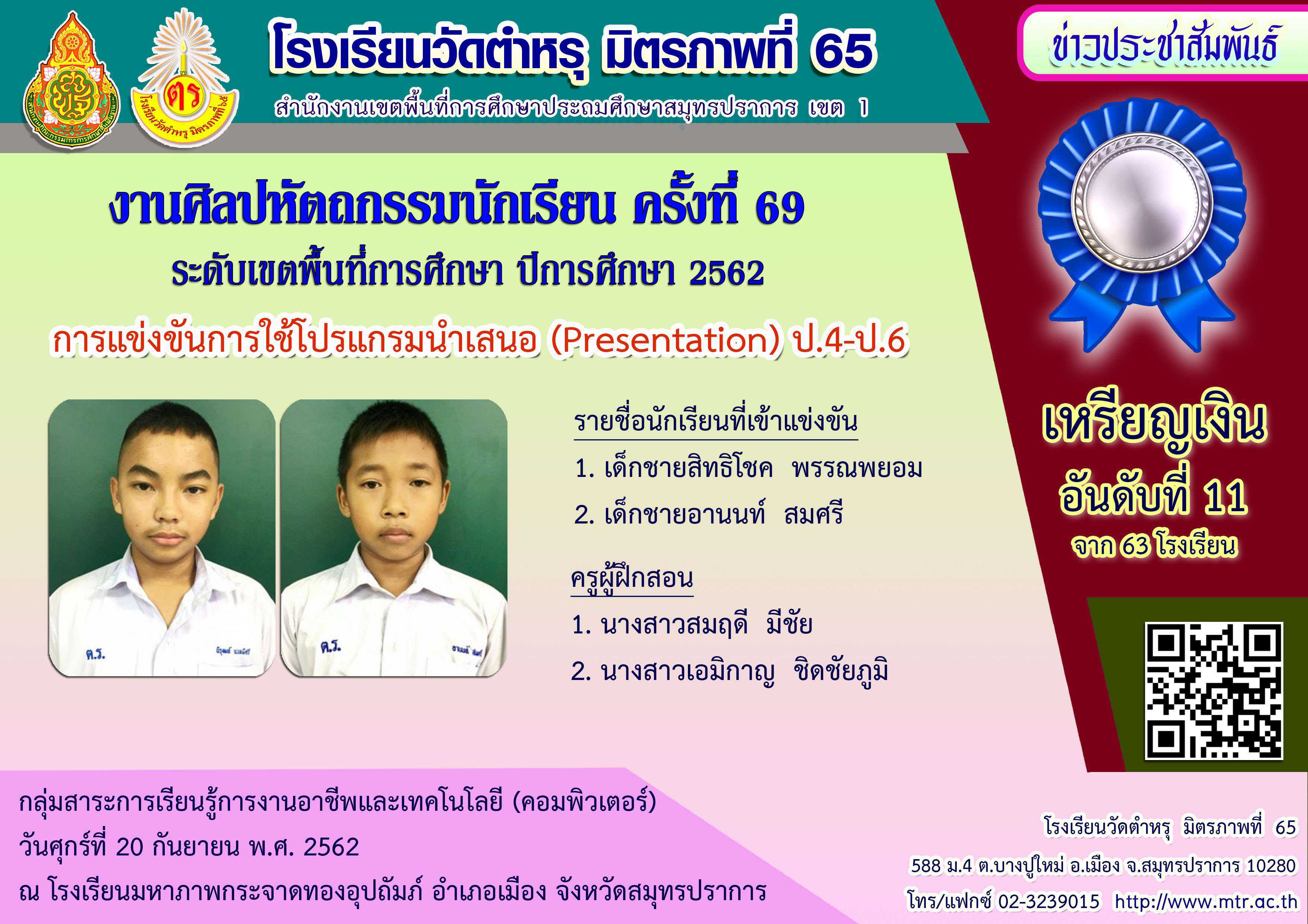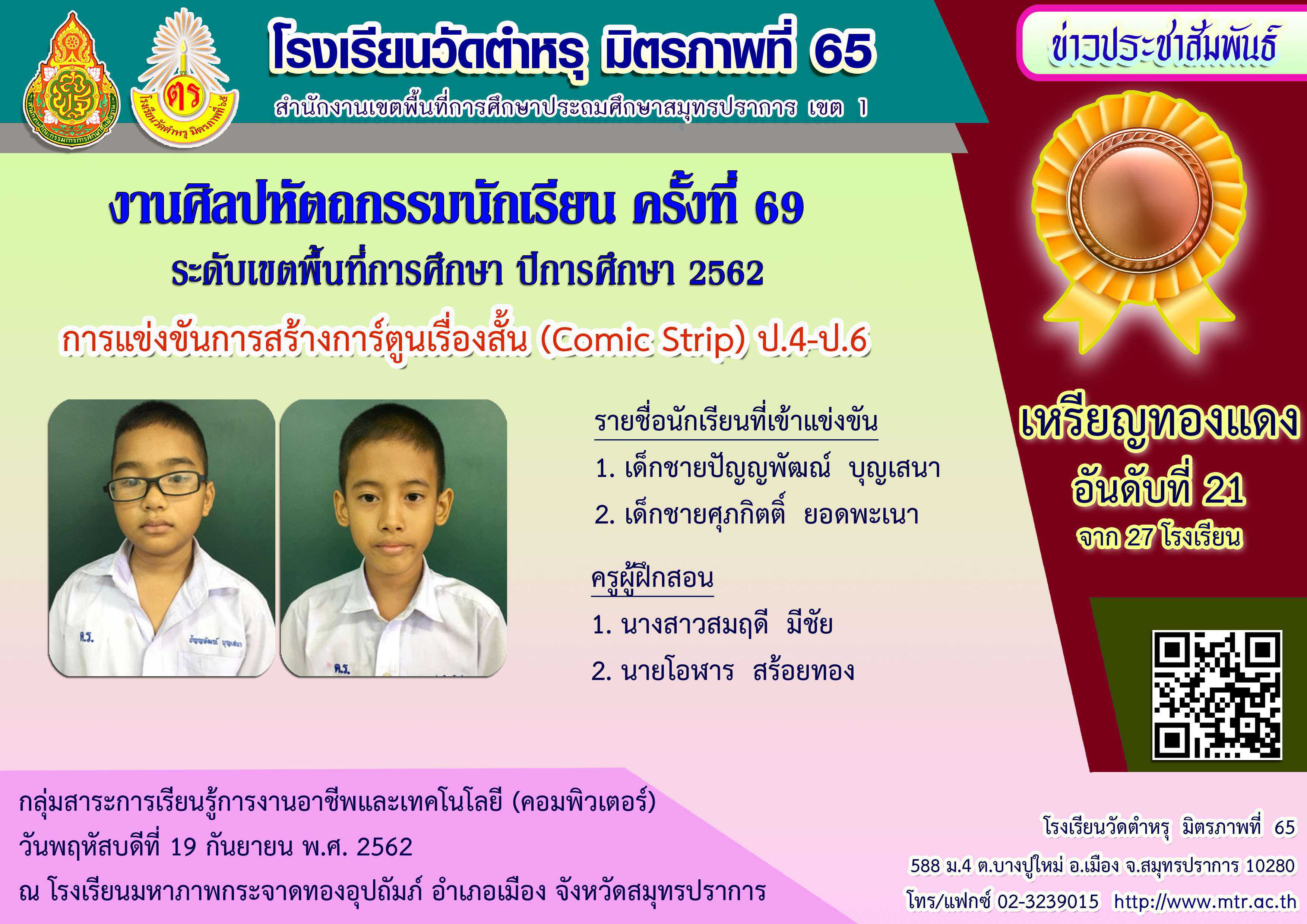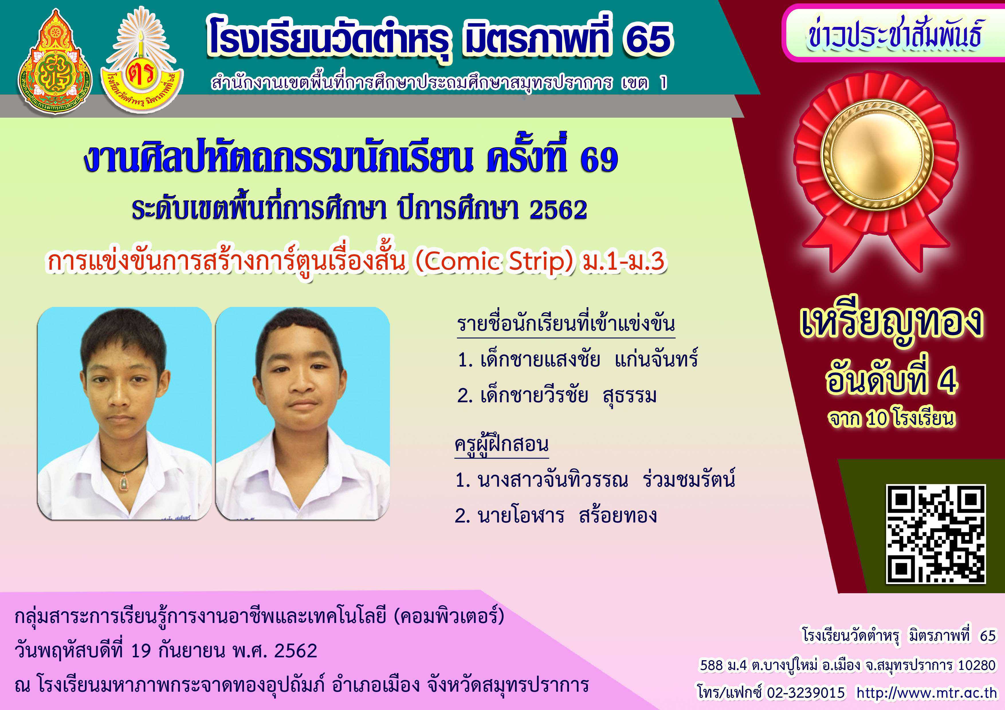 โรงเรียนวัดตำหรุ มิตรภาพที่ 65 ได้ส่งนักเรียนเข้าร่วมการแข่งขันในงานศิลปหัตถกรรมนักเรียน ครั้งที่ 69 ปีการศึกษา 2562 ระดับเขตพื้นที่ สังกัดสำนักงานเขตพื้นที่การศึกษาประถมศึกษาสมุทรปราการ เขต 1 กลุ่มสาระการเรียนรู้การงานอาชีพและเทคโนโลยี (คอมพิวเตอร์) ณ โรงเรียนมหาภาพกระจาดทองอุปถัมภ์ อ.เมือง จ.สมุทรปราการ ในวันที่ 19-20 กันยายน พ.ศ. 2562 โดยมีรายการแข่งขันดังนี้ 1. การแข่งขันการสร้างเกมสร้างสรรค์จากคอมพิวเตอร์ ม.1-ม.3 ได้รับรางวัลเหรียญทอง รองชนะเลิศอันดับที่ 1 2. การแข่งขันการสร้างการ์ตูนเรื่องสั้น (Comic Strip)ม.1-ม.3 ได้รับรางวัลเหรียญทอง อันดับที่ 4 3. การแข่งขันการออกแบบสิ่งของเครื่องใช้ด้วยโปรแกรมคอมพิวเตอร์ ม.1-ม.3 ได้รับรางวัลเหรียญทอง อันดับที่ 6 4. การแข่งขันการสร้างเกมสร้างสรรค์จากคอมพิวเตอร์ ป.4-ป.6 ได้รับรางวัลเหรียญทอง อันดับที่ 10 5. การแข่งขันการใช้โปรแกรมนำเสนอ (Presentation) ป.4-ป.6 ได้รับรางวัลเหรียญเงิน อันดับที่ 11 6. การแข่งขันการสร้างการ์ตูนเรื่องสั้น (Comic Strip) ป.4-ป.6 ได้รับรางวัลเหรียญทองแดง อันดับที่ 21 7. การแข่งขันการสร้างการ์ตูนด้วยโปรแกรมคอมพิวเตอร์กราฟิก ป.1-ป.3 ได้รับรางวัลเหรียญทองแดง อันดับที่ 33 S:1
