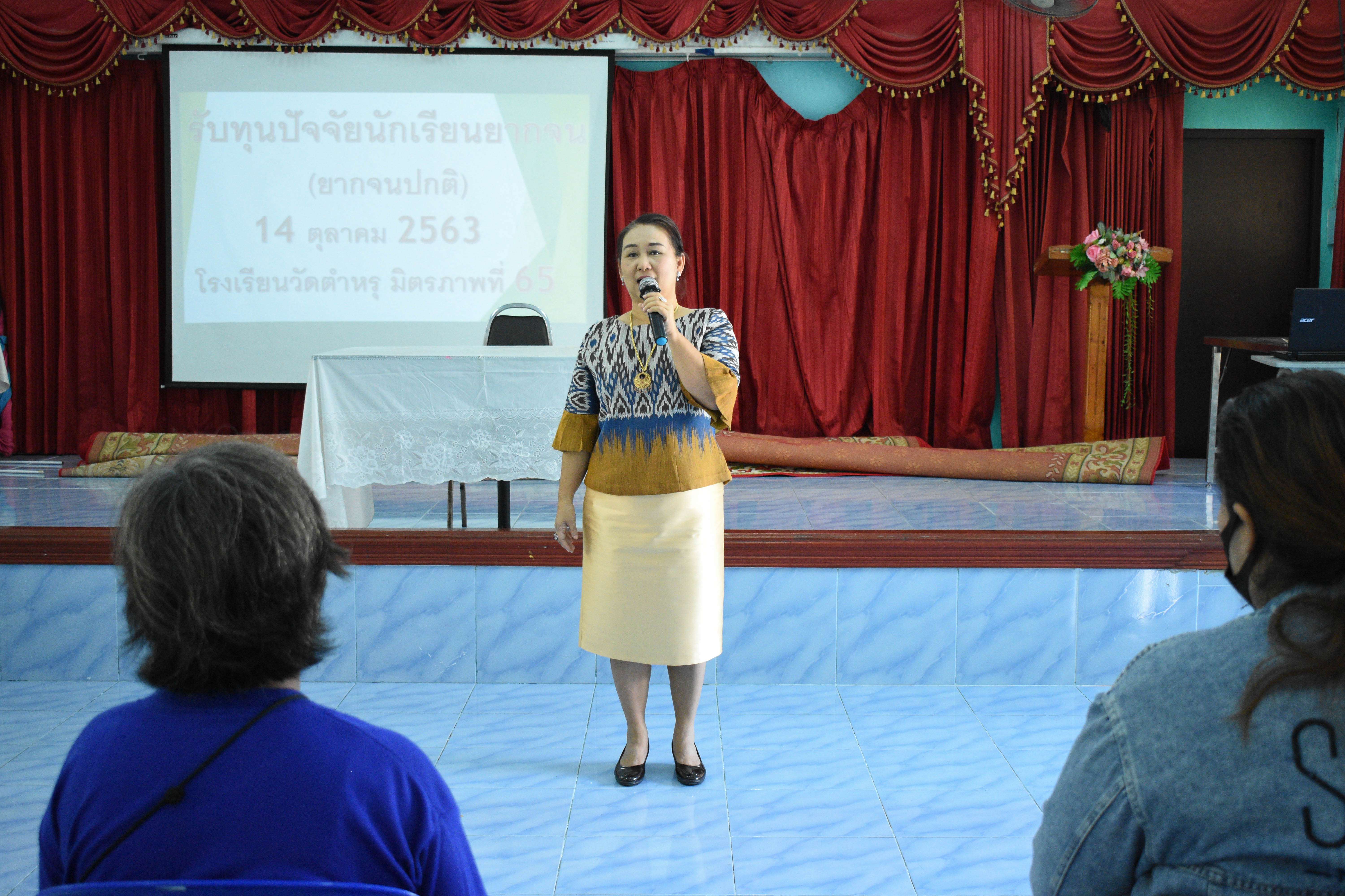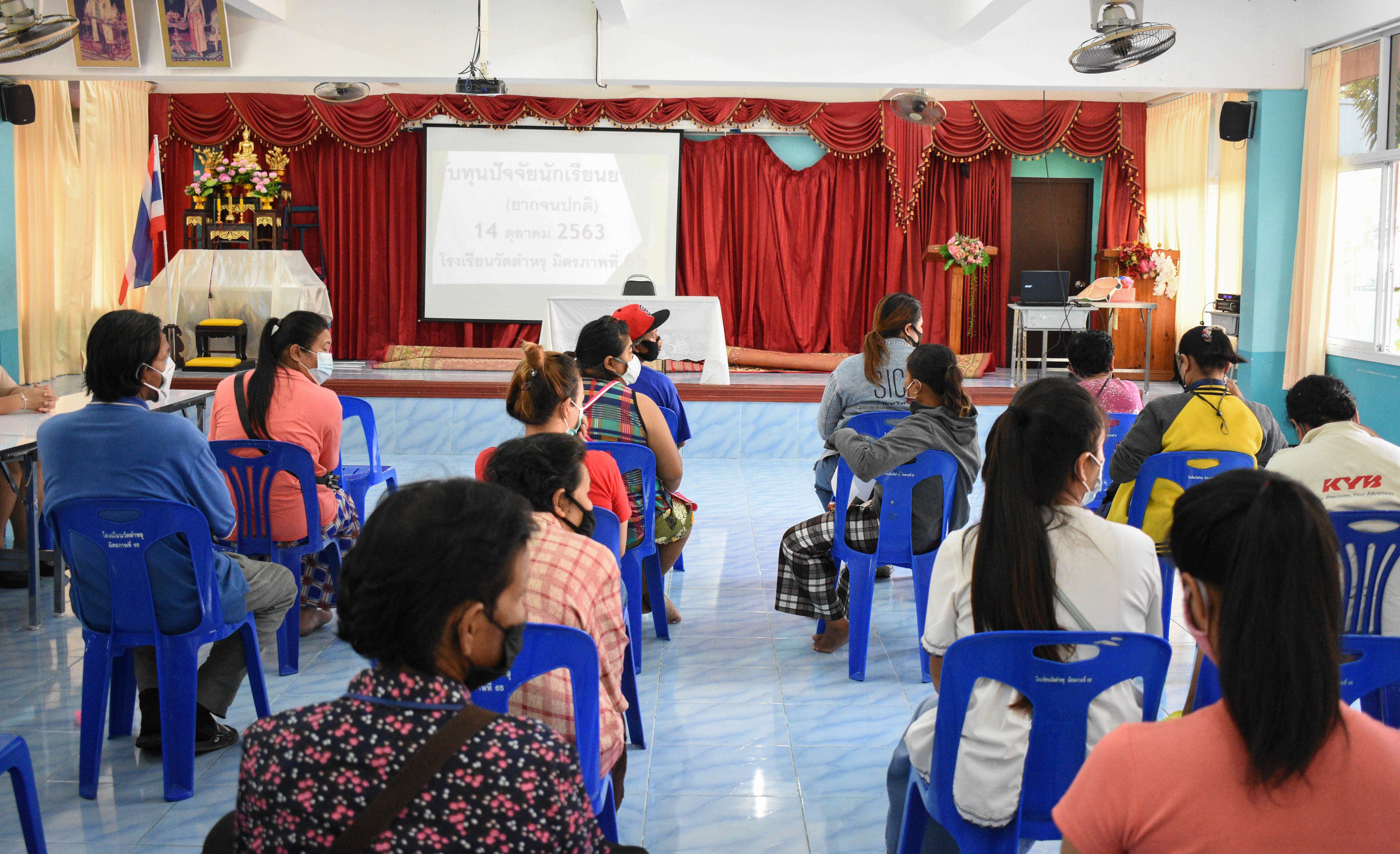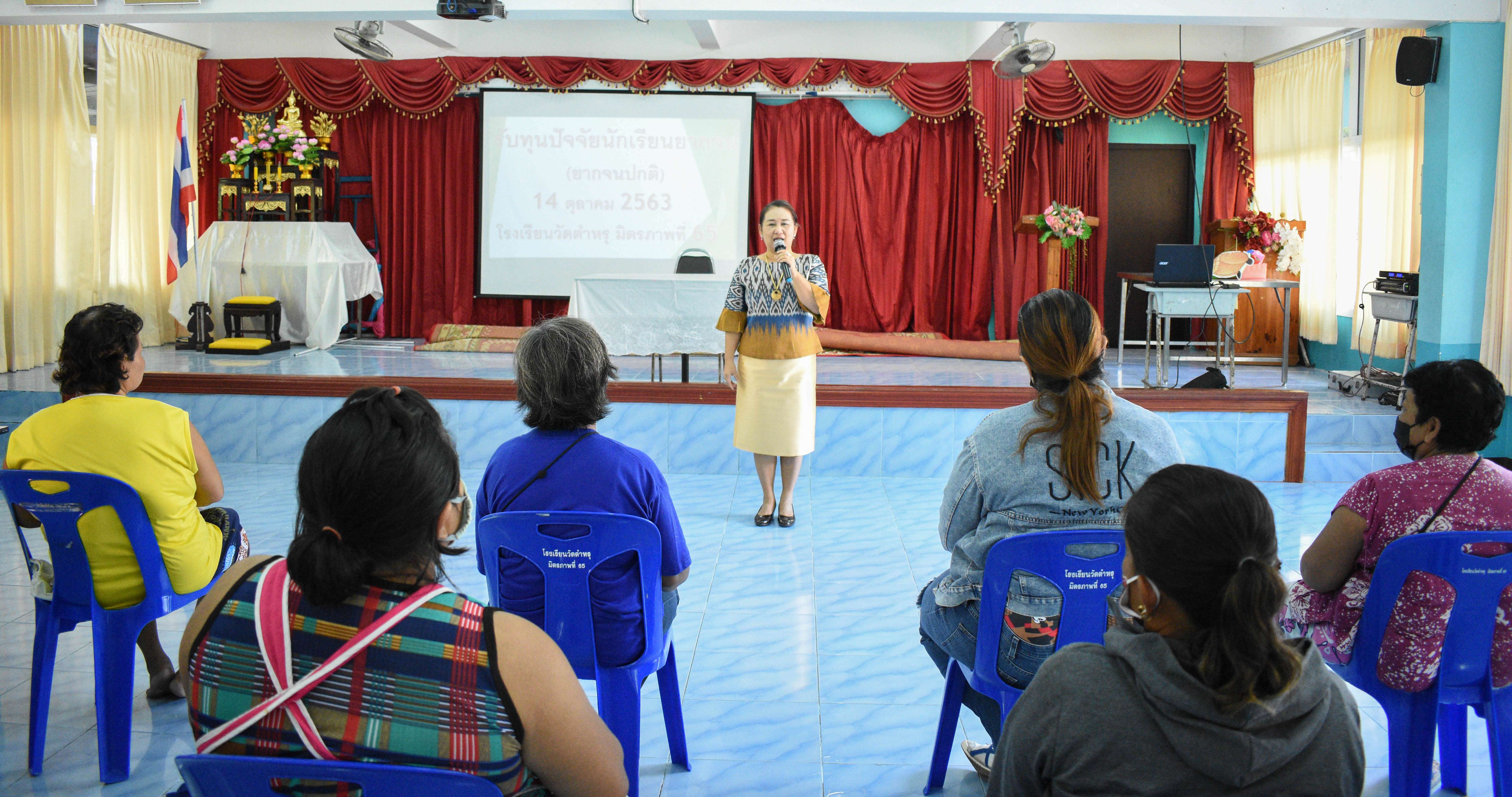 วันพุธที่ 14 ตุลาคม 2563 โรงเรียนวัดตำหรุ มิตรภาพที่ 65 ได้ดำเนินการจ่ายเงินสนับสนุนค่าจัดการเรียนการสอน ปัจจัยพื้นฐานนักเรียนยากจน(ยากจนปกติ) ภาคเรียนที่ 1 ปีการศึกษา 2563 ณ ห้องประชุมอาคาร 6 ของโรงเรียน นำโดยนางรัชนี อุทัยรัตน์ ผู้อำนวยการโรงเรียน กล่าวต้อนรับผู้ปกครองนักเรียนและชี้แจงถึงวัตถุประสงค์ของการมอบทุนในครั้งนี้ เพื่อขยายโอกาสการเข้าถึงบริหารการศึกษาและการเรียนรู้ตลอดชีวิตอย่างทั่วถึงและมีคุณภาพ S:1