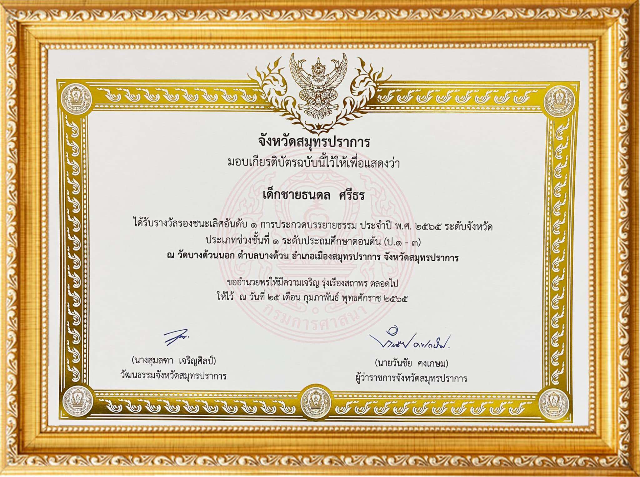 วันพุธที่ 30 มีนาคม 2565 นางรัชนี อุทัยรัตน์ ผู้อำนวยการโรงเรียนวัดตำหรุ มิตรภาพที่ 65 มอบหมายให้นายพรภวิษย์ มนตร์วัชรินทร์ รองผู้อำนวยการโรงเรียน นำคณะครูและนักเรียนเข้ารับเกียรติบัตรการประกวดบรรยายธรรม ประจำปี 2565 ระดับจังหวัด เพื่อเป็นตัวแทนเข้าประกวดบรรยายธรรมระดับภาคคณะสงฆ์ จากนายวันชัย คงเกษม ผู้ว่าราชการจังหวัดสมุทรปราการ ณ ห้องประชุม1 ศาลากลางจังหวัดสมุทรปราการ โดยมีนักเรียนจำนวน 3 คน ดังนี้ ช่วงชั้นที่ 1 รางวัลขนะเลิศ คือ เด็กหญิงกนกวรรณ เหล็กกล้า ครูผู้ฝึกสอนนางสาวหทัยรัตน์ หมุนคำ, รางวัลรองชนะเลิศอันดับ 1 คือ เด็กชายธนดล ศรีธร ครูผู้ฝึกสอนนางหทัยรัตน์ แปงจิตร์ และช่วงชั้นที่ 3 ได้รับรางวัลรองชนะเลิศ อันดับ 2 คือ เด็กหญิงน้ำเพชร อรุณกิตติรัตน์ ครูผู้ฝึกสอนนางสาวจันทิวรรณ ร่วมชมรัตน์ และนางสาวอรพรรณ จรูญศักดิ์วิวัฒน์ S:1