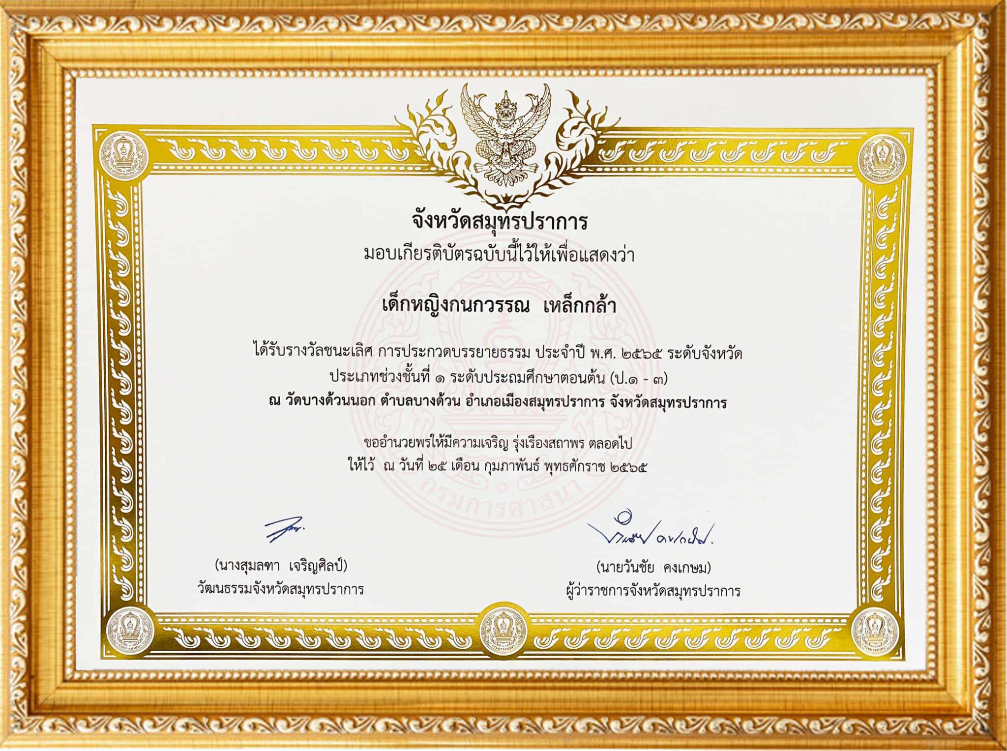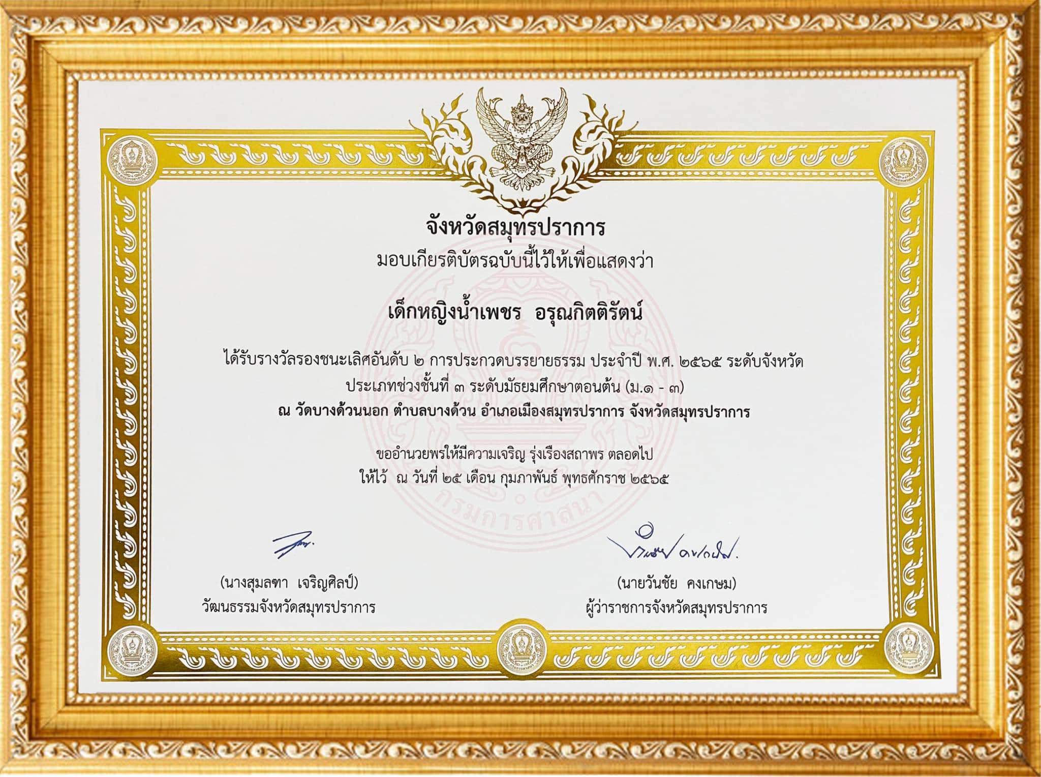 เข้ารับเกียรติบัตรการประกวดบรรยายธรรม ประจำปี 2565 ระดับจังหวัด