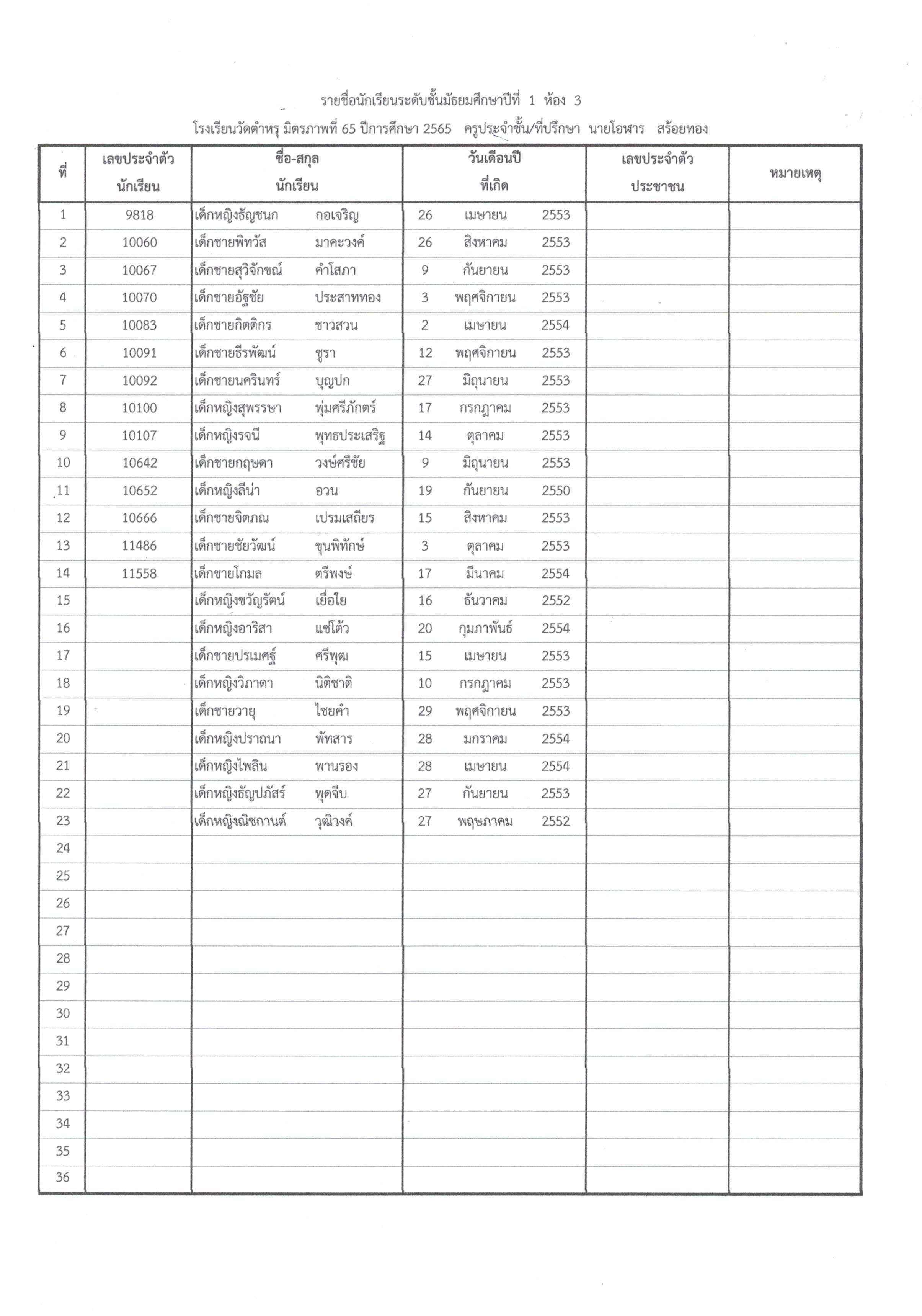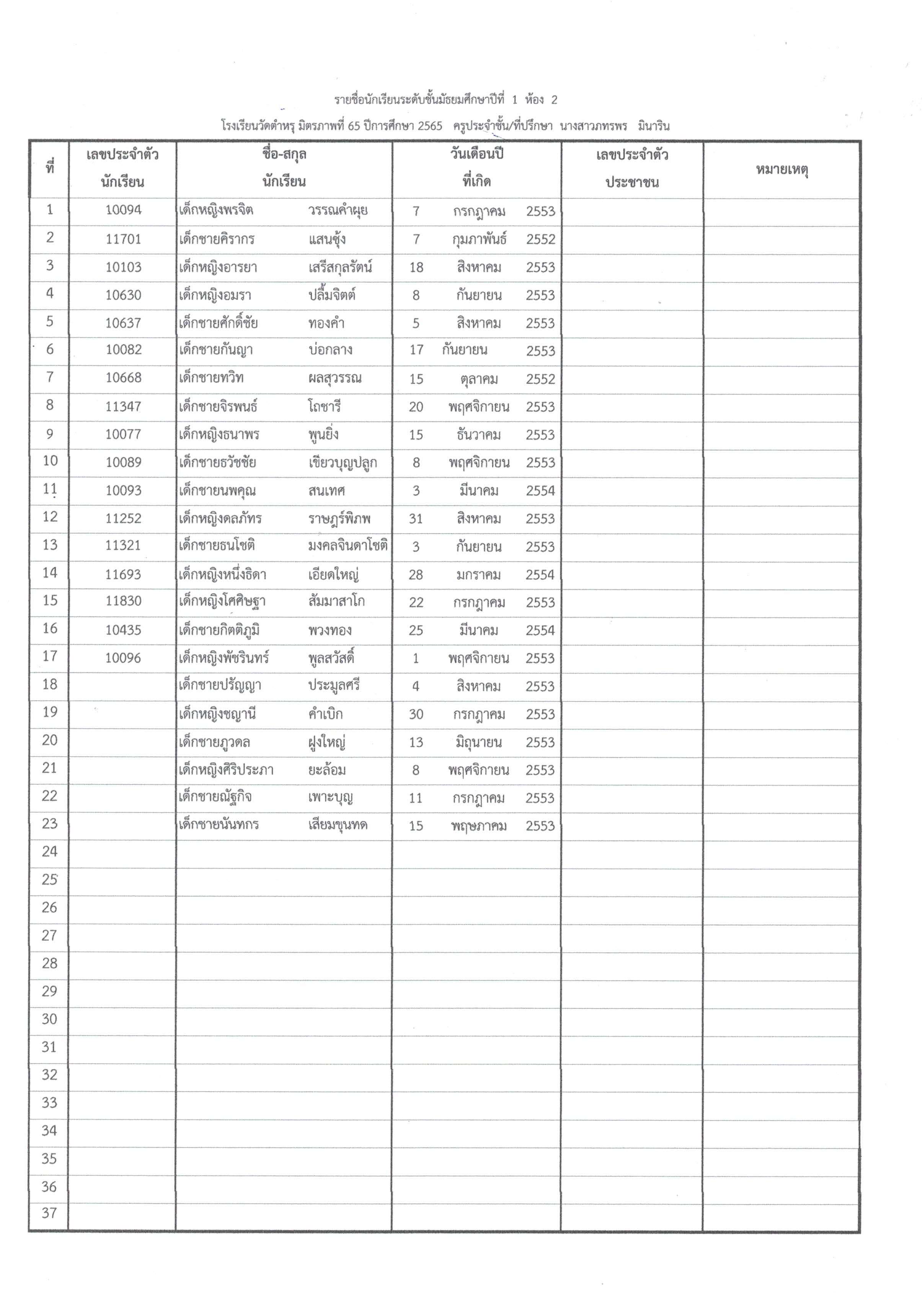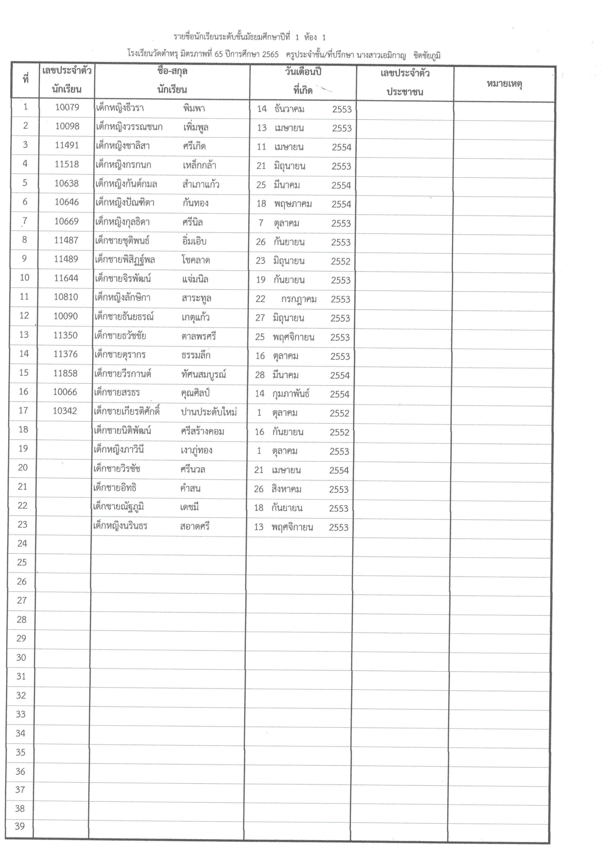 ประกาศรายชื่อนักเรียนที่ได้รับการคัดเลือกเข้าเรียน ปีการศึกษา 2566 ชั้นมัธยมศึกษาปีที่ 1