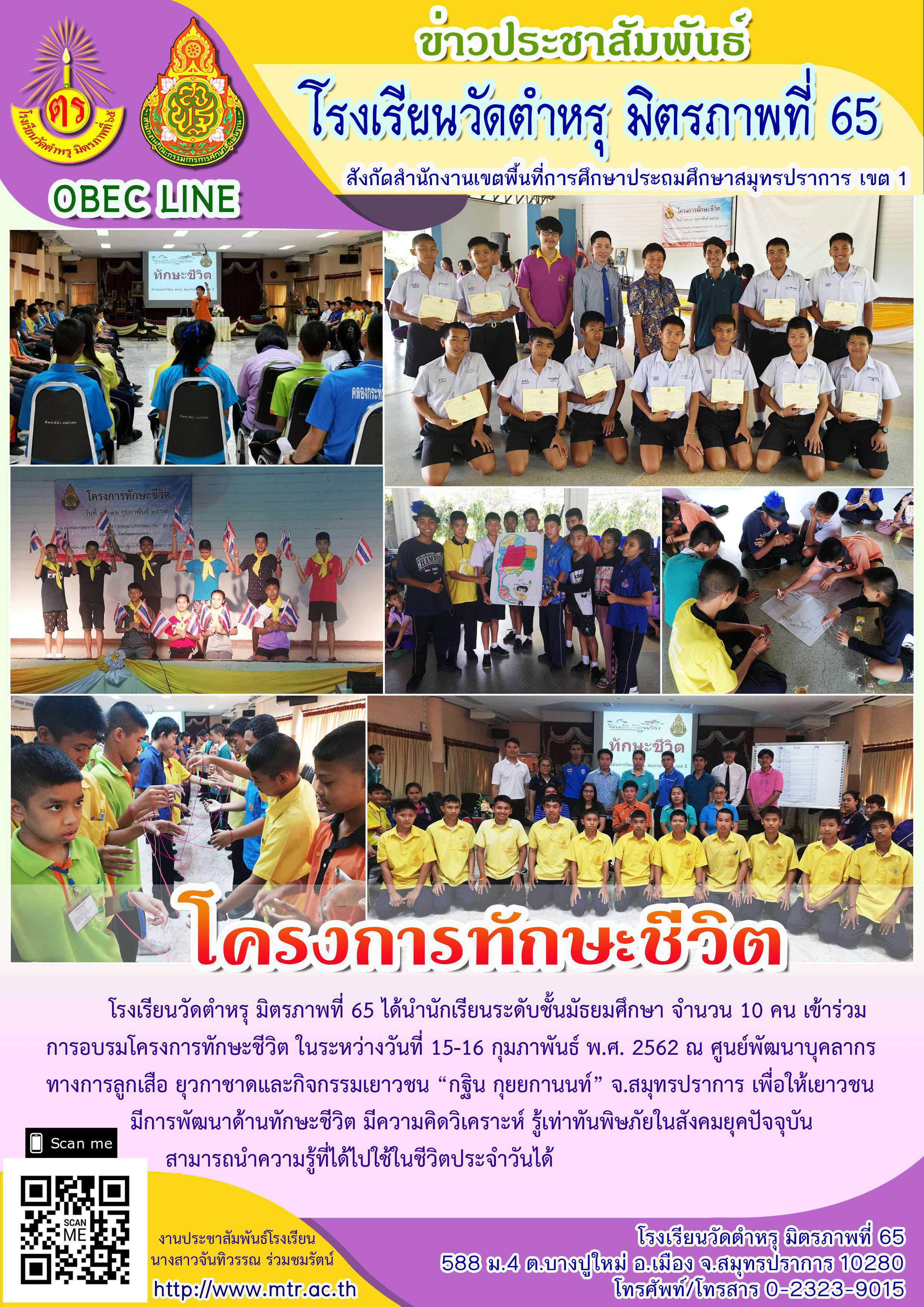 โรงเรียนวัดตำหรุ มิตรภาพที่ 65 ได้นำนักเรียนระดับชั้นมัธยมศึกษา จำนวน 10 คน เข้าร่วม การอบรมโครงการทักษะชีวิต ในระหว่างวันที่ 15-16 กุมภาพันธ์ พ.ศ. 2562 ณ ศูนย์พัฒนาบุคลากร ทางการลูกเสือ ยุวกาชาดและกิจกรรมเยาวชน ?กฐิน กุยยกานนท์? จ.สมุทรปราการ เพื่อให้เยาวชน มีการพัฒนาด้านทักษะชีวิต มีความคิดวิเคราะห์ รู้เท่าทันพิษภัยในสังคมยุคปัจจุบัน สามารถนำความรู้ที่ได้ไปใช้ในชีวิตประจำวันได้ S:1