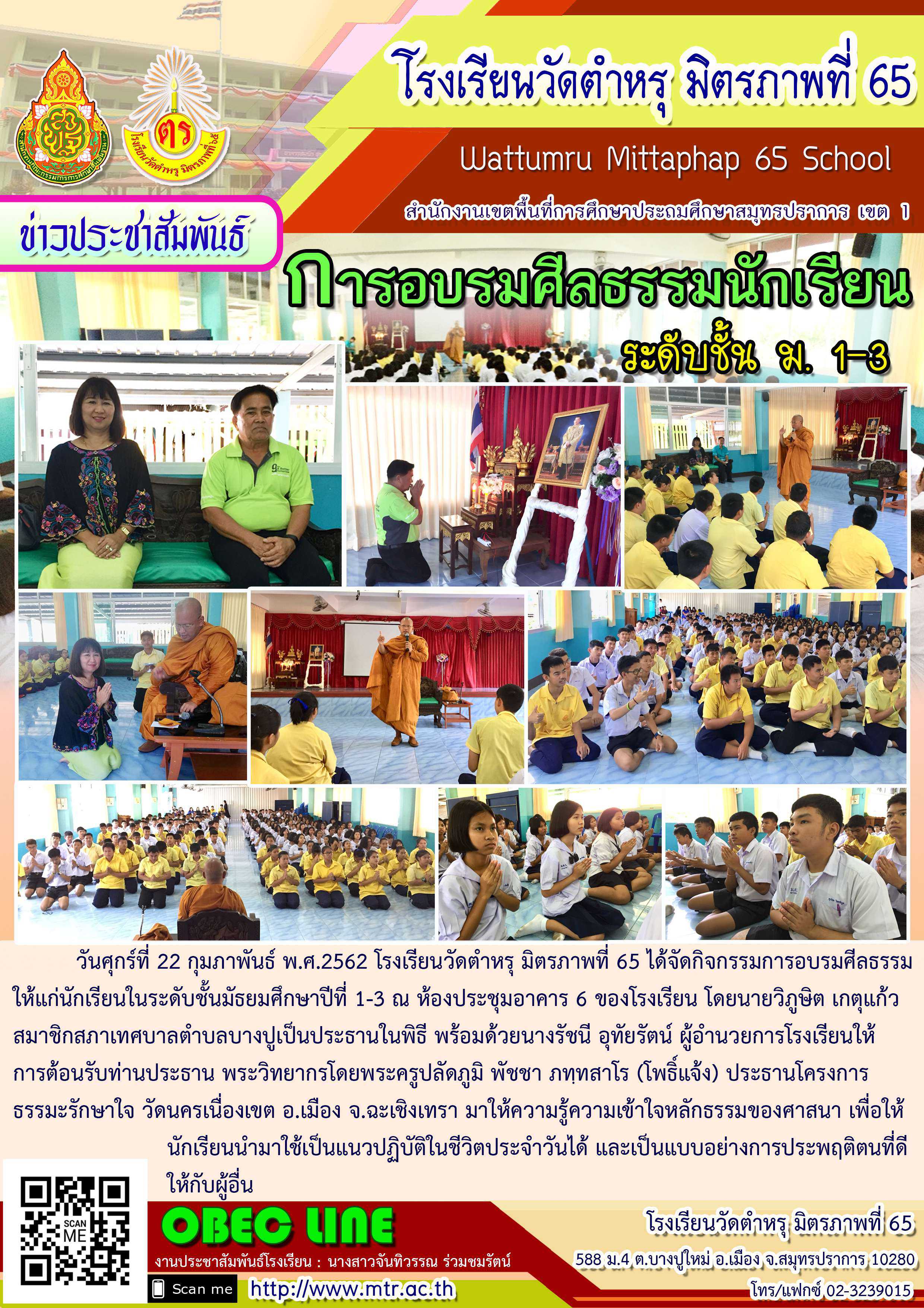 วันศุกร์ที่ 22 กุมภาพันธ์ พ.ศ.2562 โรงเรียนวัดตำหรุ มิตรภาพที่ 65 ได้จัดกิจกรรมการอบรมศีลธรรมให้แก่นักเรียนในระดับชั้นมัธยมศึกษาปีที่ 1-3 ณ ห้องประชุมอาคาร 6 ของโรงเรียน โดยนายวิภูษิต เกตุแก้ว สมาชิกสภาเทศบาลตำบลบางปูเป็นประธานในพิธี พร้อมด้วยนางรัชนี อุทัยรัตน์ ผู้อำนวยการโรงเรียนให้การต้อนรับท่านประธาน พระวิทยากรโดยพระครูปลัดภูมิ พัชชา ภทฺทสาโร (โพธิ์แจ้ง) ประธานโครงการธรรมะรักษาใจ วัดนครเนื่องเขต อ.เมือง จ.ฉะเชิงเทรา มาให้ความรู้ความเข้าใจหลักธรรมของศาสนา เพื่อให้นักเรียนนำมาใช้เป็นแนวปฏิบัติในชีวิตประจำวันได้ และเป็นแบบอย่างการประพฤติตนที่ดีให้กับผู้อื่น S:1