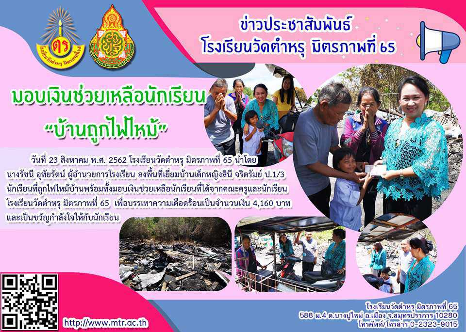มอบเงินช่วยเหลือนักเรียนบ้านถูกไฟไหม้