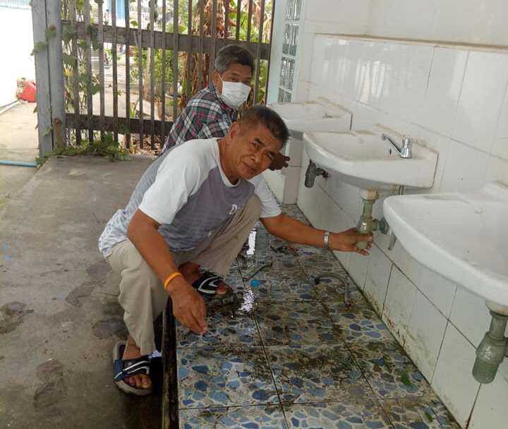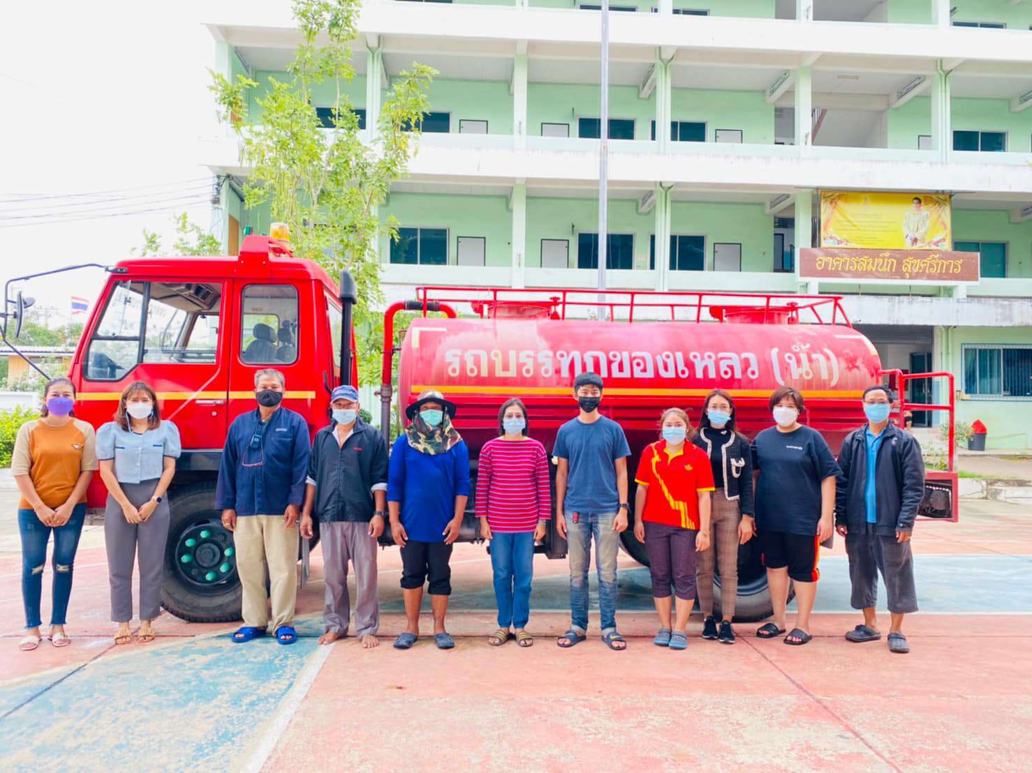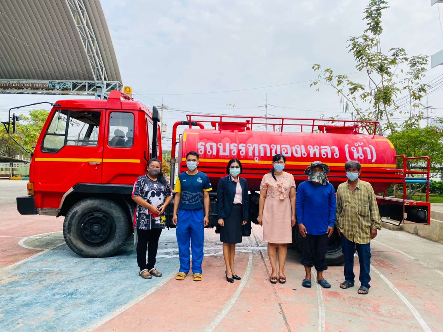 การประปาเทศบาลตำบล บางปู นำเจ้าหน้าที่พร้อมรถดับเพลิงมาฉีดน้ำทำความสะอาดพื้นสนามภายในบริเวณโรงเรียน