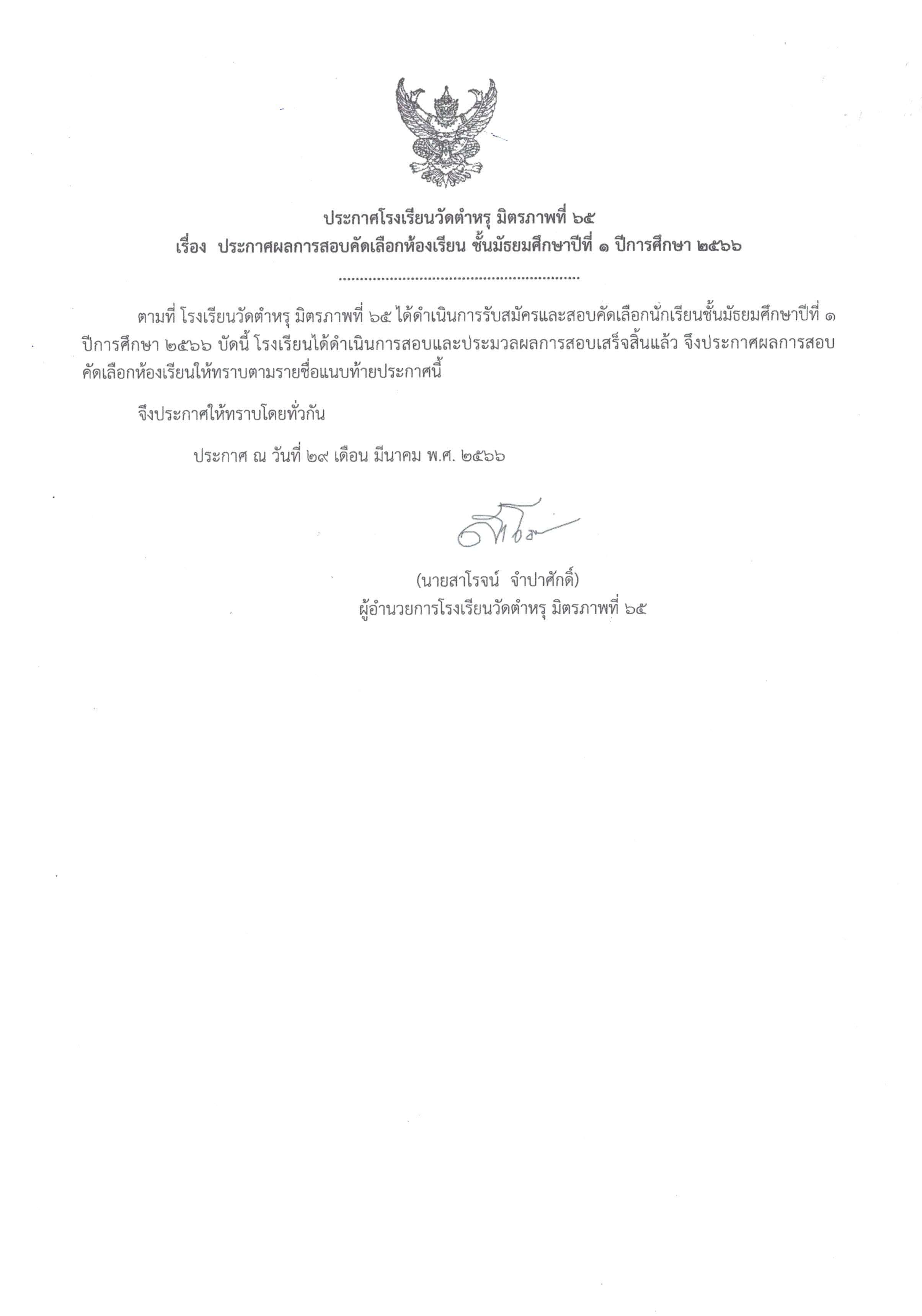 ประกาศรายชื่อนักเรียนที่ได้รับการคัดเลือกเข้าเรียน ปีการศึกษา 2566 ชั้นมัธยมศึกษาปีที่ 1