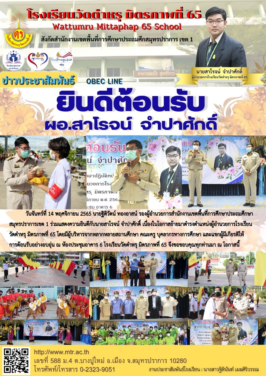 ต้อนรับนายสาโรจน์ จำปาศักดิ์ ดำรงตำแหน่ง ผู้อำนวยการโรงเรียนวัดตำหรุ มิตรภาพที่ 65