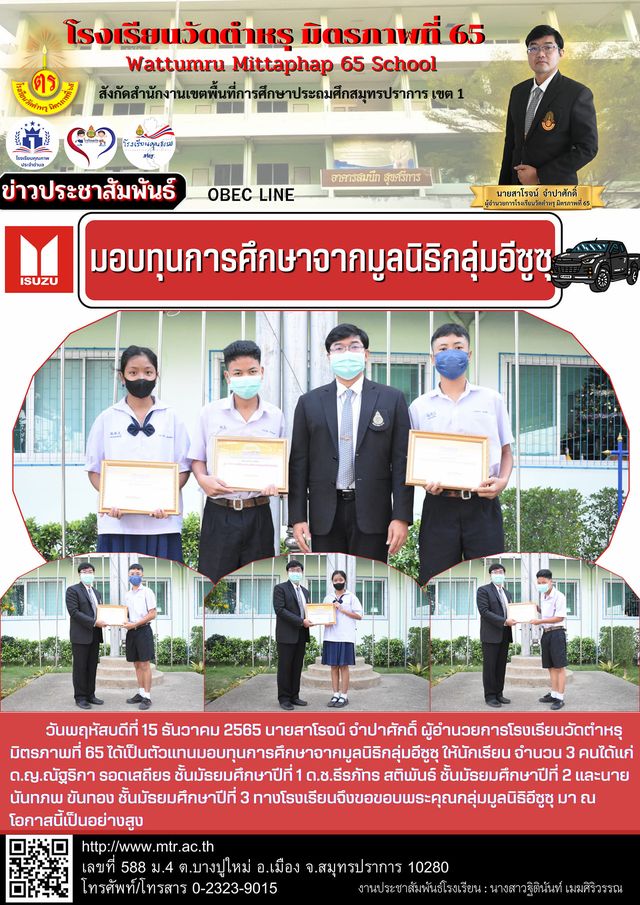 วันพฤหัสบดีที่ 15 ธันวาคม 2565 นายสาโรจน์ จำปาศักดิ์ ผู้อำนวยการโรงเรียนวัดตำหรุ มิตรภาพที่ 65 ได้เป็นตัวแทนมอบทุนการศึกษาจากมูลนิธิกลุ่มอีซูซุ