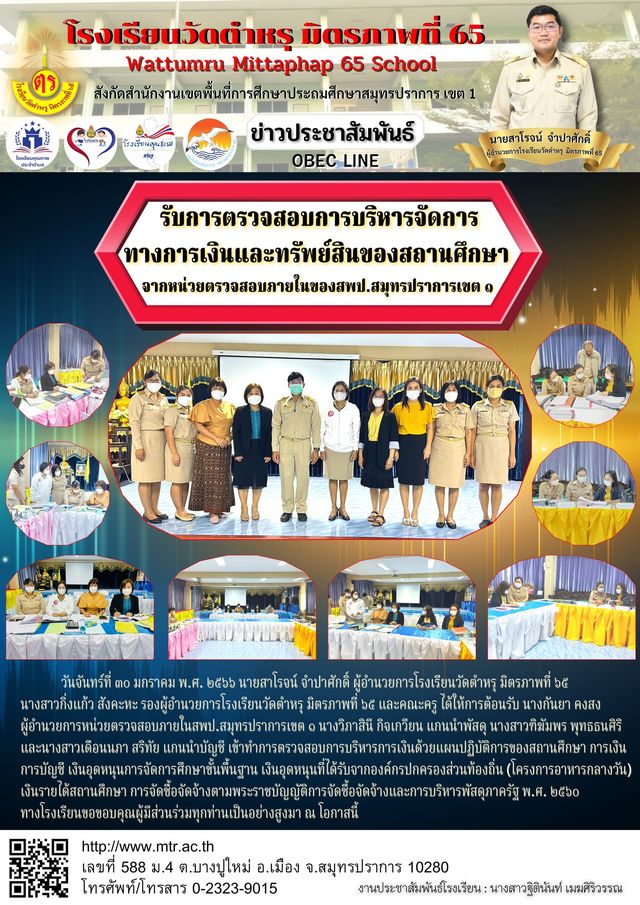 วันจันทร์ที่ ๓๐ มกราคม พ.ศ. ๒๕๖๖ นายสาโรจน์ จำปาศักดิ์ ผู้อำนวยการโรงเรียนวัดตำหรุ มิตรภาพที่ ๖๕ นางสาวกิ่งแก้ว สังคะหะ รองผู้อำนวยการโรงเรียน        วัดตำหรุ มิตรภาพที่ ๖๕ และคณะครู ได้ให้การต้อนรับ นางกันยา คงสง ผู้อำนวยการหน่วยตรวจสอบภายในสพป.สมุทรปราการเขต ๑ นางวิภาสินี กิจเกวียน แกนนำพัสดุ นางสาวฑิฆัมพร พุทธธนศิริ และนางสาวเดือนนภา สริทัย แกนนำบัญชี เข้าทำการตรวจสอบการบริหารการเงินด้วยแผนปฏิบัติการของสถานศึกษา การเงิน  การบัญชี เงินอุดหนุนการจัดการศึกษาขั้นพื้นฐาน เงินอุดหนุนที่ได้รับจากองค์กรปกครองส่วนท้องถิ่น(โครงการอาหารกลางวัน) เงินรายได้สถานศึกษา การจัดซื้อจัดจ้างตามพระราชบัญญัติการจัดซื้อจัดจ้างและการบริหารพัสดุภาครัฐ พ.ศ. ๒๕๖๐ ทางโรงเรียนขอขอบคุณผู้มีส่วนร่วมทุกท่านเป็นอย่างสูงมา ณ โอกาสนี้
