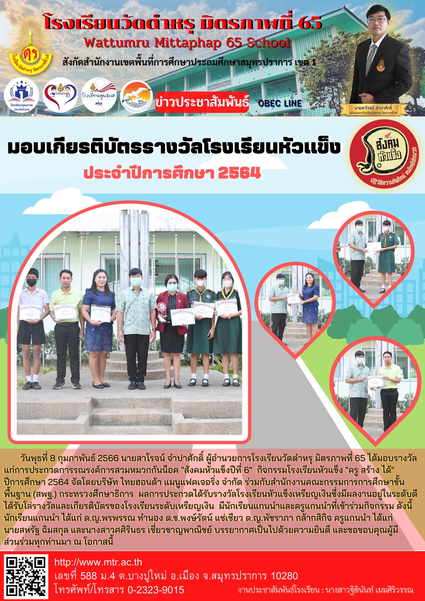 วันพุธที่ 8 กุมภาพันธ์ 2566 นายสาโรจน์ จำปาศักดิ์ ผู้อำนวยการโรงเรียนวัดตำหรุ มิตรภาพที่ 65 ได้มอบรางวัลแก่การประกวดการรณรงค์การสวมหมวกกันน็อค "สังคมหัวแข็งปีที่ 6" กิจกรรมโรงเรียนหัวแข็ง "ครู สร้าง ได้" ปีการศึกษา 2564 จัดโดยบริษัท ไทยฮอนด้า แมนูแฟคเจอริ่ง จำกัด ร่วมกับสำนักงานคณะกรรมการ  การศึกษาขั้นพื้นฐาน (สพฐ.) ผลการประกวดได้รับรางวัลโรงเรียนหัวแข็งเหรียญเงินซึ่งมีผลงานอยู่ในระดับดี ได้รับโล่รางวัลและเกียรติบัตรของโรงเรียนระดับเหรียญเงิน มีนักเรียนแกนนำและครูแกนนำที่เข้าร่วมกิจกรรมดังนี้ นักเรียนแกนนำ ได้แก่ ด.ญ.พรพรรณ ทำนอง ด.ช.พงษ์รัตน์ แซ่เซียว ด.ญ.พัชราภา กล้ากสิกิจ ครูแกนนำ ได้แก่ นายสหรัฐ ฉิมสกุล และนางสาวศศิรินธร เชี่ยวชาญพาณิชย์ บรรยากาศเป็นไปด้วยความยินดี และขอขอบคุณผู้มีส่วนร่วมทุกท่านมา ณ โอกาสนี้
