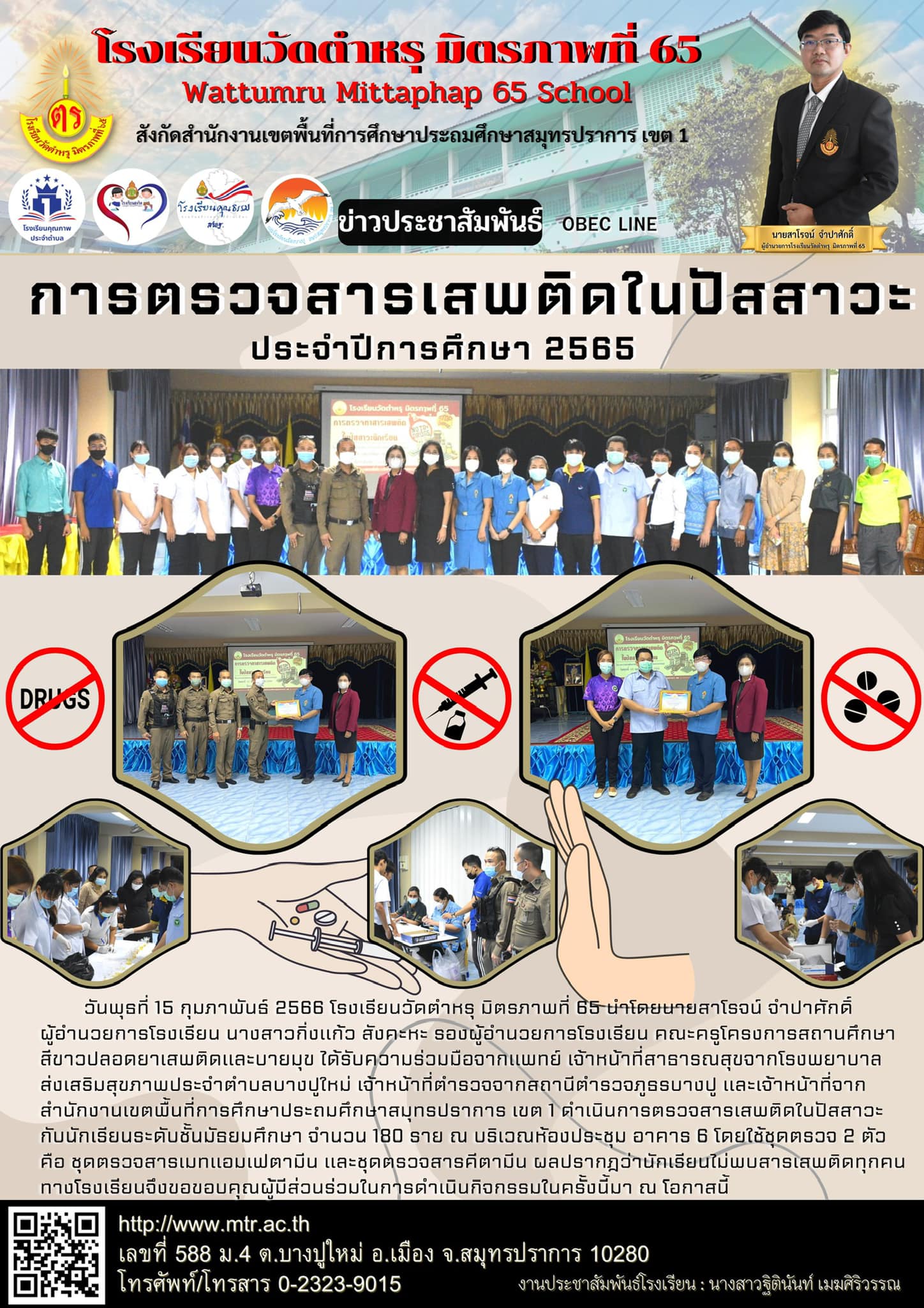 วันพุธที่ 15 กุมภาพันธ์ 2566 โรงเรียนวัดตำหรุ มิตรภาพที่ 65 นำโดยนายสาโรจน์ จำปาศักดิ์ ผู้อำนวยการโรงเรียน นางสาวกิ่งแก้ว สังคะหะ รองผู้อำนวยการโรงเรียน คณะครูในโครงการสถานศึกษาสีขาวปลอดยาเสพติดและบายมุข ได้รับความร่วมมือจากแพทย์ เจ้าหน้าที่สาธารณสุขจากโรงพยาบาลส่งเสริมสุขภาพประจำตำบลบางปูใหม่ เจ้าหน้าที่ตำรวจจากสถานีตำรวจภูธรบางปู และเจ้าหน้าที่จากสำนักงานเขตพื้นที่การศึกษาประถมศึกษาสมุทรปราการ เขต 1 ดำเนินการตรวจสารเสพติดในปัสสาวะกับนักเรียนระดับชั้นมัธยมศึกษา จำนวน 180 ราย ณ บริเวณห้องประชุมอาคาร 6 โดยใช้ชุดตรวจ 2 ตัว คือ ชุดตรวจสารเมทแอมเฟตามีน และชุดตรวจสารคีตามีน ผลปรากฎว่านักเรียนไม่พบสารเสพติดทุกคน ทางโรงเรียนจึงขอขอบคุณผู้มีส่วนร่วมในการดำเนินกิจกรรมในครั้งนี้มา ณ โอกาสนี้
