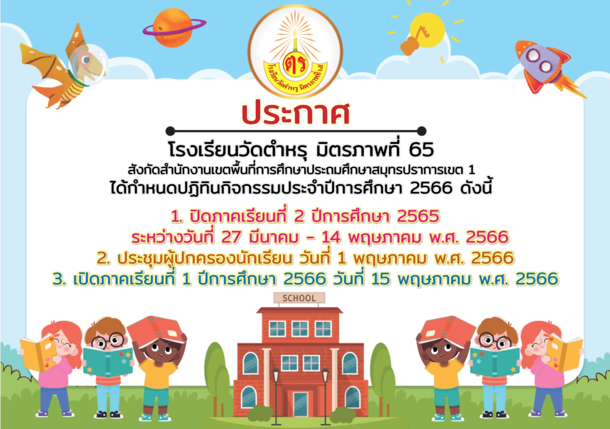 ????https://static.xx.fbcdn.net/images/emoji.php/v9/t6d/1/16/1f4ef.png" style="border:0px; height:16px; width:16px" />ประกาศจากทางโรงเรียนวัดตำหรุมิตรภาพที่ 65