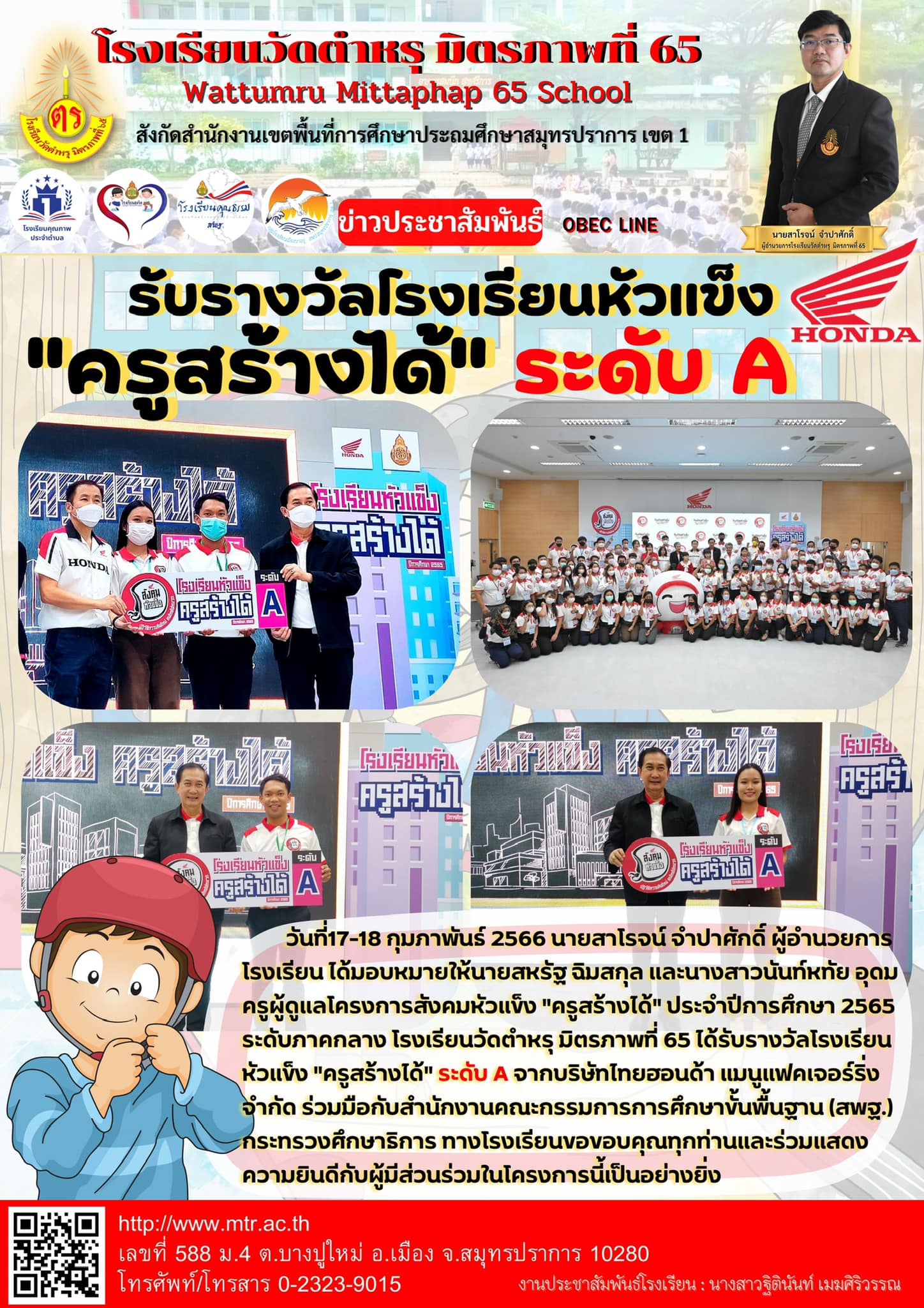 วันที่17-18 กุมภาพันธ์ 2566 นายสาโรจน์ จำปาศักดิ์ ผู้อำนวยการโรงเรียน ได้มอบหมายให้นายสหรัฐ ฉิมสกุล และนางสาวนันท์หทัย อุดม ครูผู้ดูแลโครงการสังคมหัวแข็ง "ครูสร้างได้" ประจำปีการศึกษา 2565 ระดับภาคกลาง โรงเรียนวัดตำหรุ มิตรภาพที่ 65 ได้รับรางวัลโรงเรียนหัวแข็ง "ครูสร้างได้" ระดับ A จากบริษัทไทยฮอนด้า แมนูแฟคเจอร์ริ่ง จำกัด ร่วมมือกับสำนักงานคณะกรรมการการศึกษาขั้นพื้นฐาน (สพฐ.) กระทรวงศึกษาธิการ ทางโรงเรียนขอขอบคุณทุกท่านและร่วมแสดงความยินดีกับผู้มีส่วนร่วมในโครงการนี้เป็นอย่างยิ่ง
