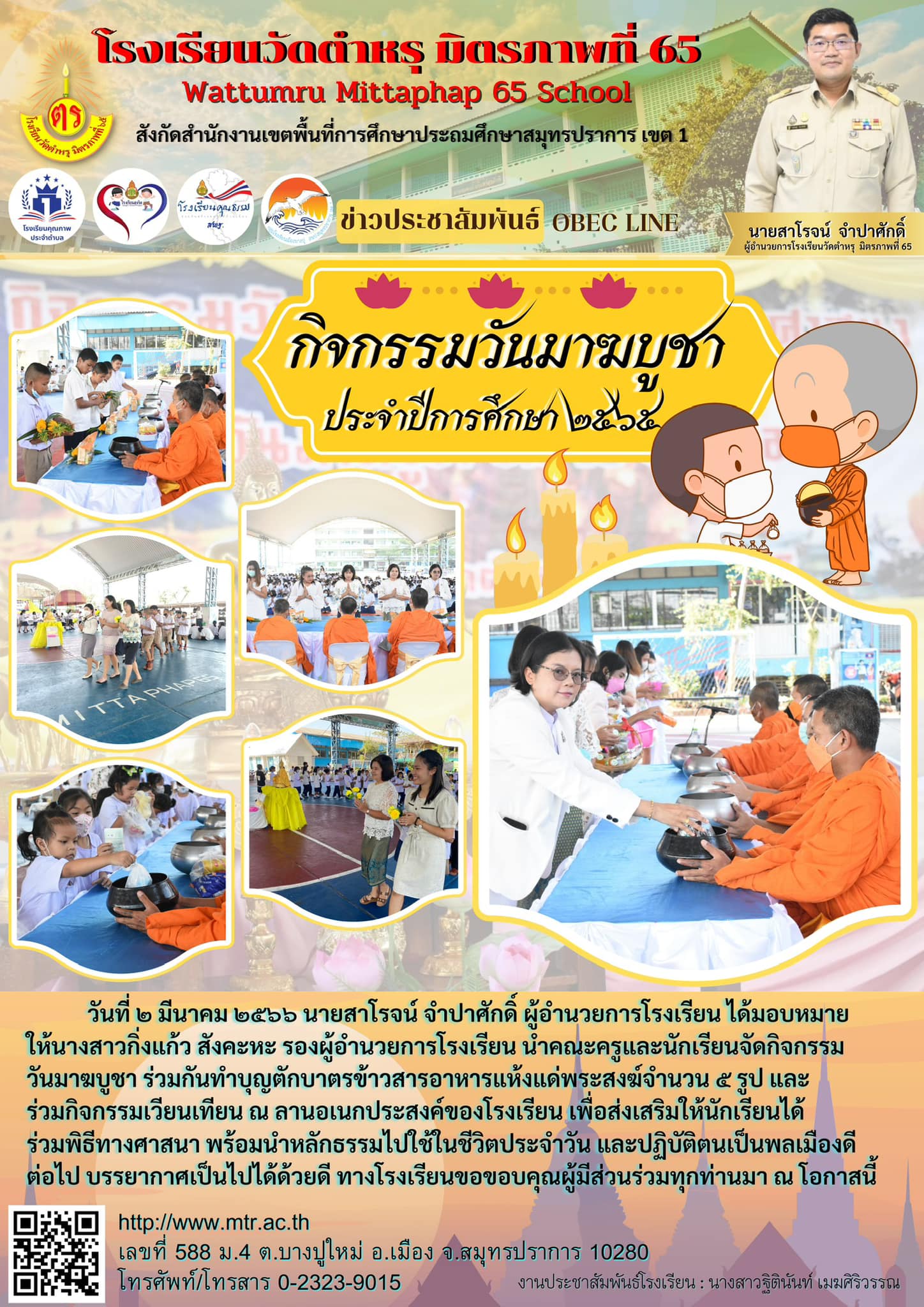 วันที่ ๒ มีนาคม ๒๕๖๖ นายสาโรจน์ จำปาศักดิ์ ผู้อำนวยการโรงเรียน ได้มอบหมายให้นางสาวกิ่งแก้ว สังคะหะ รองผู้อำนวยการโรงเรียน นำคณะครูและนักเรียนจัดกิจกรรมวันมาฆบูชา ร่วมกันทำบุญตักบาตรข้าวสารอาหารแห้งแด่พระสงฆ์จำนวน ๕ รูปและร่วมกิจกรรมเวียนเทียน ณ ลานอเนกประสงค์ของโรงเรียน เพื่อส่งเสริมให้นักเรียนได้ร่วมพิธีทางศาสนา พร้อมนำหลักธรรมไปใช้ในชีวิตประจำวัน และปฏิบัติตนเป็นพลเมืองดีต่อไป บรรยากาศเป็นไปได้ด้วยดี ทางโรงเรียนขอขอบคุณผู้มีส่วนร่วมทุกท่านมา ณ โอกาสนี้
