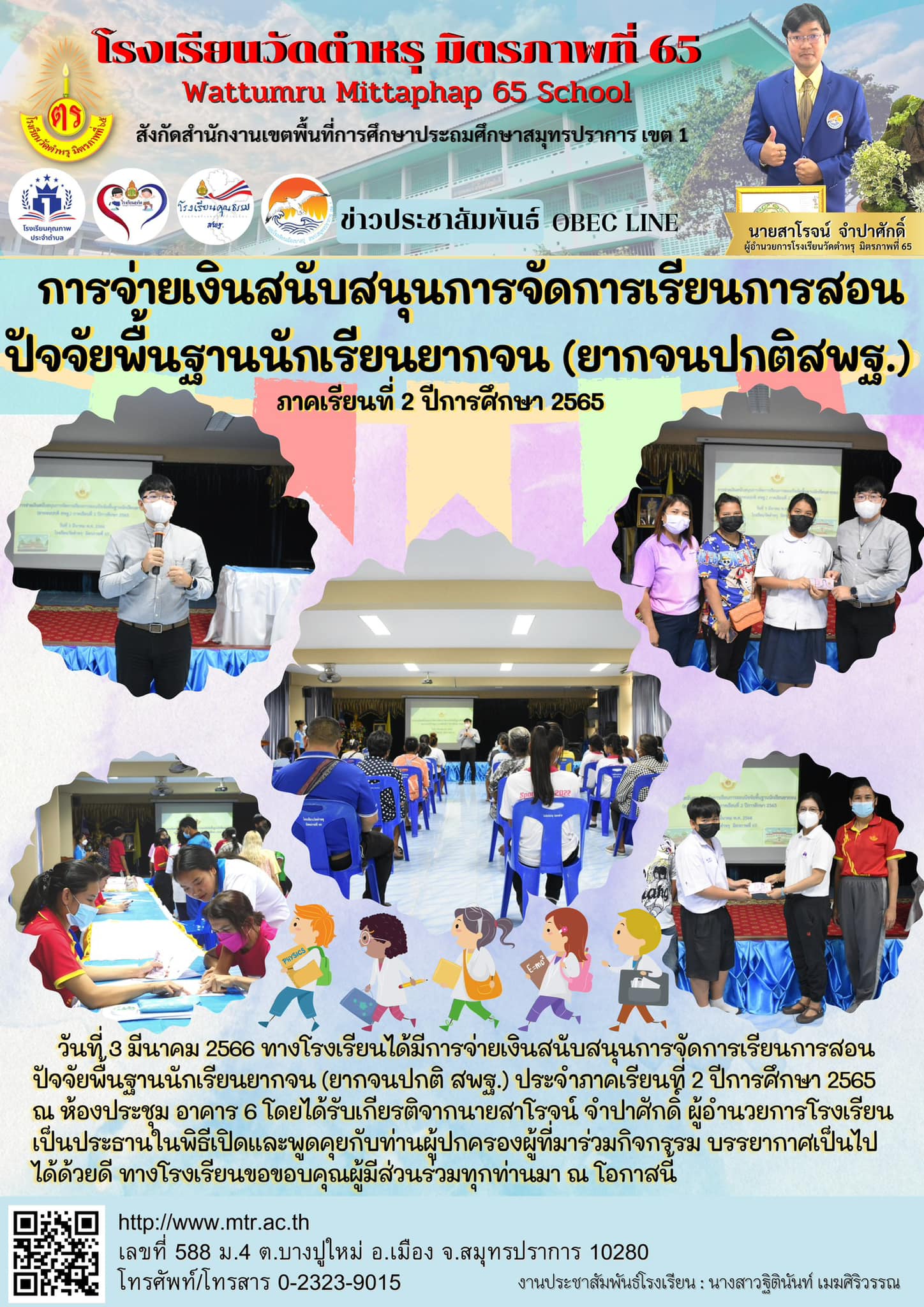 วันที่ 3 มีนาคม 2566 ทางโรงเรียนได้มีการจ่ายเงินสนับสนุนการจัดการเรียนการสอนปัจจัยพื้นฐานนักเรียนยากจน (ยากจนปกติ สพฐ.) ประจำภาคเรียนที่ 2 ปีการศึกษา 2565 ณ ห้องประชุม อาคาร 6 โดยได้รับเกียรติจากนายสาโรจน์ จำปาศักดิ์ ผู้อำนวยการโรงเรียน เป็นประธานในพิธีเปิดและพูดคุยกับท่านผู้ปกครองผู้ที่มาร่วมกิจกรรม บรรยากาศเป็นไปได้ด้วยดี ทางโรงเรียนขอขอบคุณผู้มีส่วนร่วมทุกท่านมา ณ โอกาสนี้