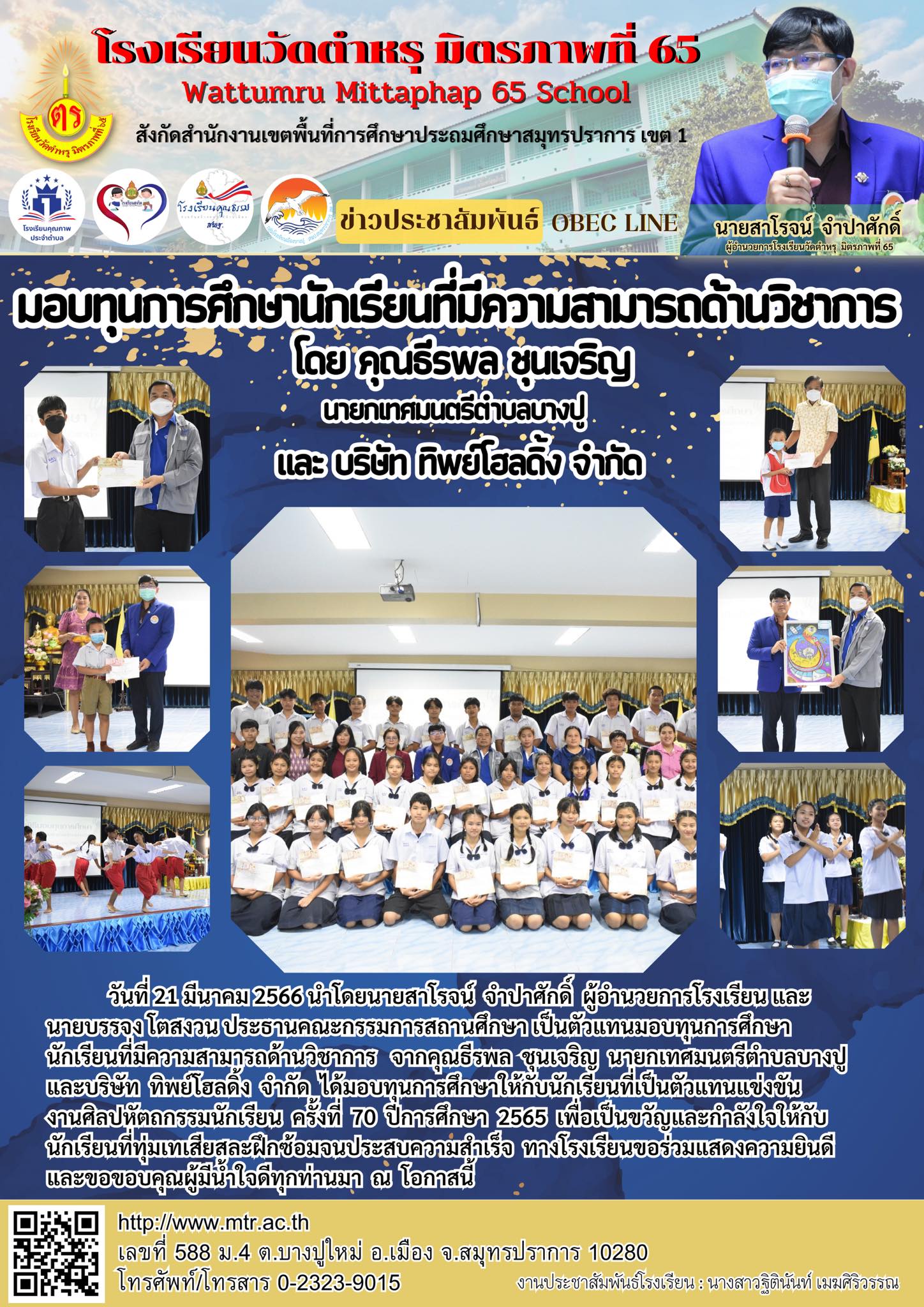 วันอังคารที่ 21 มีนาคม 2566 นำโดยนายสาโรจน์ จำปาศักดิ์ ผู้อำนวยการโรงเรียน และนายบรรจง โตสงวน ประธานคณะกรรมการสถานศึกษา เป็นตัวแทนมอบทุนการศึกษานักเรียนที่มีความสามารถด้านวิชาการ จากคุณธีรพล ชุนเจริญ นายกเทศมนตรีตำบลบางปู และบริษัท ทิพย์โฮลดิ้ง จำกัด ได้มอบทุนการศึกษาให้กับนักเรียนที่เป็นตัวแทนแข่งขันในงานศิลปหัตถกรรมนักเรียน ครั้งที่ 70 ปีการศึกษา 2565 เพื่อเป็นขวัญและกำลังใจให้กับนักเรียนที่ทุ่มเทเสียสละฝึกซ้อมจนประสบความสำเร็จ ทางโรงเรียนขอร่วมแสดงความยินดี และขอขอบคุณผู้มีน้ำใจดีทุกท่านมา ณ โอกาสนี้