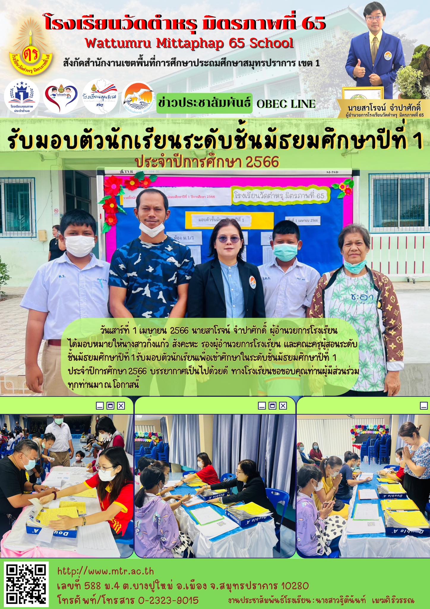 วันเสาร์ที่ 1 เมษายน 2566 นายสาโรจน์ จำปาศักดิ์ ผู้อำนวยการโรงเรียน ได้มอบหมายให้นางสาวกิ่งแก้ว สังคะหะ รองผู้อำนวยการโรงเรียน และคณะครูผู้สอนระดับชั้นมัธยมศึกษาปีที่ 1 รับมอบตัวนักเรียนเพื่อเข้าศึกษาในระดับชั้นมัธยมศึกษาปีที่ 1 ประจำปีการศึกษา 2566 บรรยากาศเป็นไปด้วยดี ทางโรงเรียนขอขอบคุณท่านผู้มีส่วนร่วมทุกท่านมา ณ โอกาสนี้