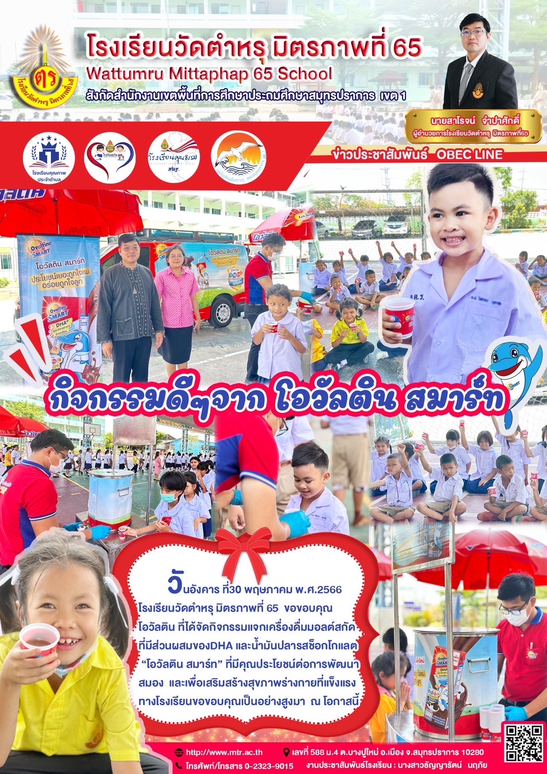 วันอังคาร ที่30 พฤษภาคม พ.ศ.2566 โรงเรียนวัดตำหรุ มิตรภาพที่ 65  ขอขอบคุณโอวัลติน ที่ได้จัดกิจกรรมแจกเครื่องดื่มมอลต์สกัดที่มีส่วนผสมของDHA และน้ำมันปลารสช็อกโกแลต “โอวัลติน สมาร์ท” ที่มีคุณประโยชน์ต่อการพัฒนาสมอง  และเพื่อเสริมสร้างสุขภาพร่างกายที่แข็งแรงทางโรงเรียนขอขอบคุณเป็นอย่างสูงมา  ณ โอกาสนี้