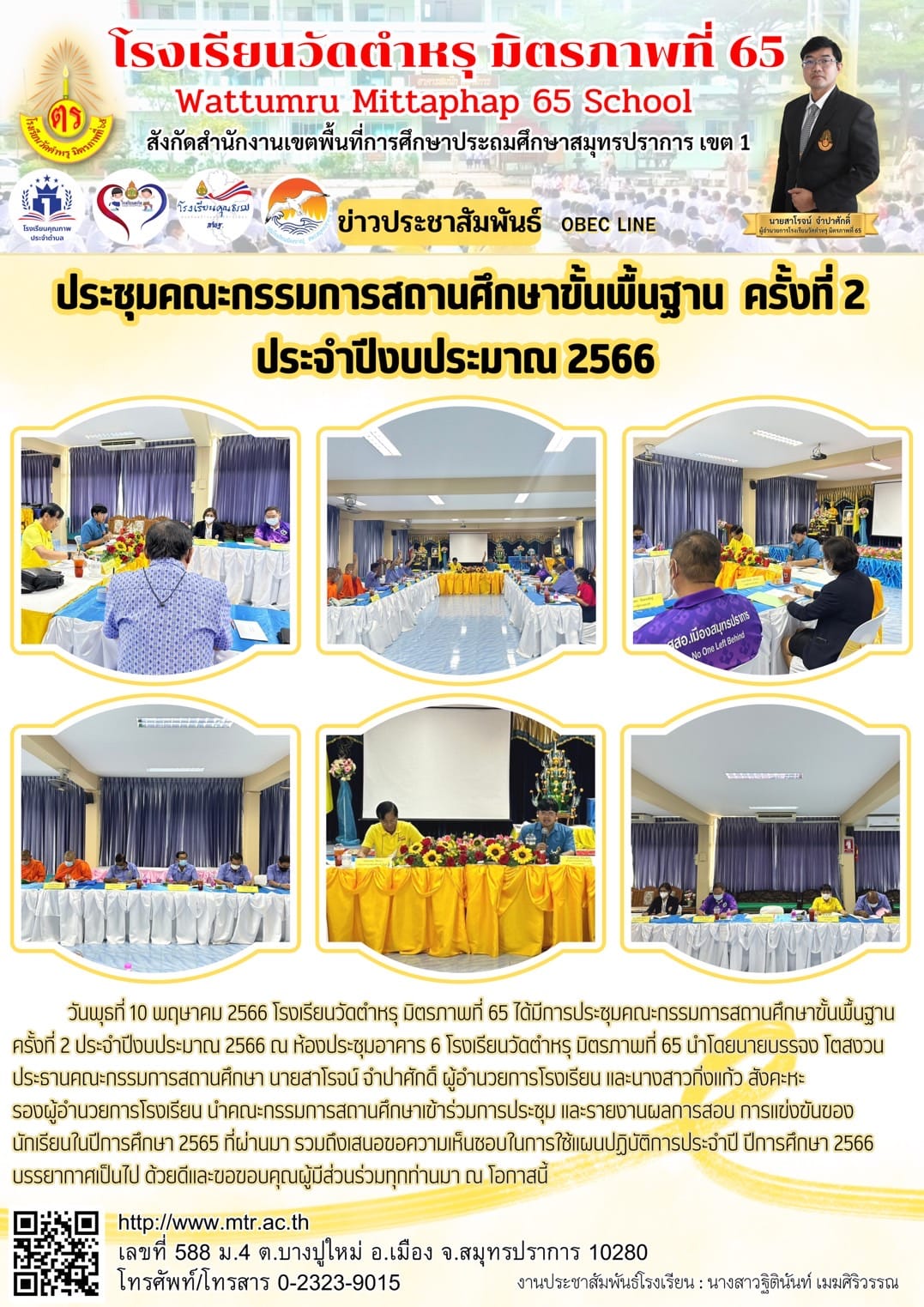 วันพุธที่ 10 พฤษาคม 2566 โรงเรียนวัดตำหรุ มิตรภาพที่ 65 ได้มีการประชุมคณะกรรมการสถานศึกษาขั้นพื้นฐาน ครั้งที่ 2 ประจำปีงบประมาณ 2566 ณ ห้องประชุมอาคาร 6 โรงเรียนวัดตำหรุ มิตรภาพที่ 65 นำโดยนายบรรจง โตสงวน ประธานคณะกรรมการสถานศึกษา นายสาโรจน์ จำปาศักดิ์ ผู้อำนวยการโรงเรียน และนางสาวกิ่งแก้ว สังคะหะ รองผู้อำนวยการโรงเรียน นำคณะกรรมการสถานศึกษาเข้าร่วมการประชุม และรายงานผลการสอบ การแข่งขันของนักเรียนในปีการศึกษา 2565 ที่ผ่านมา รวมถึงเสนอขอความเห็นชอบในการใช้แผนปฏิบัติการประจำปี ปีการศึกษา 2566 บรรยากาศเป็นไป ด้วยดีและขอขอบคุณผู้มีส่วนร่วมทุกท่านมา ณ โอกาสนี้