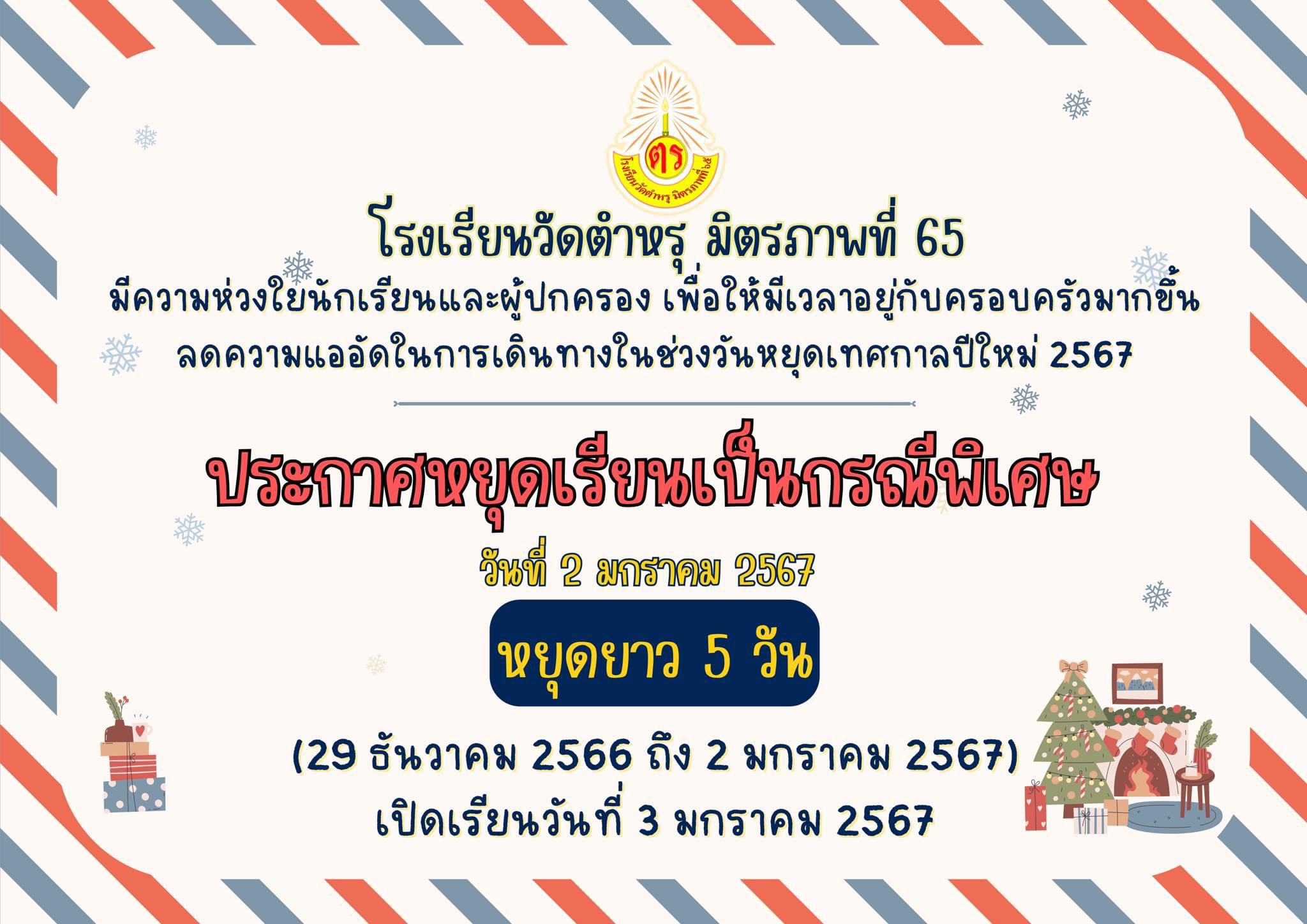 โรงเรียนวัดตำหรุ มิตรภาพที่ 65  มีความห่วงใยนักเรียนและผู้ปกครอง เพื่อให้มีเวลาอยู่กับครอบครัวมากขึ้น ลดความแออัดในการเดินทางในช่วงวันหยุดเทศกาลปีใหม่ 2567 โรงเรียนประกาศหยุดเป็นกรณีพิเศษ ในวันที่ 2 มกราคม 2567 หยุดยาว 5 วัน ตั้งแต่ 29 ธันวาคม 2566 ถึง วันที่ 2 มกราคม 2567 โรงเรียนจะเปิดทำการเรียนการสอนตามปกติในวันที่ 3 มกราคม 2567