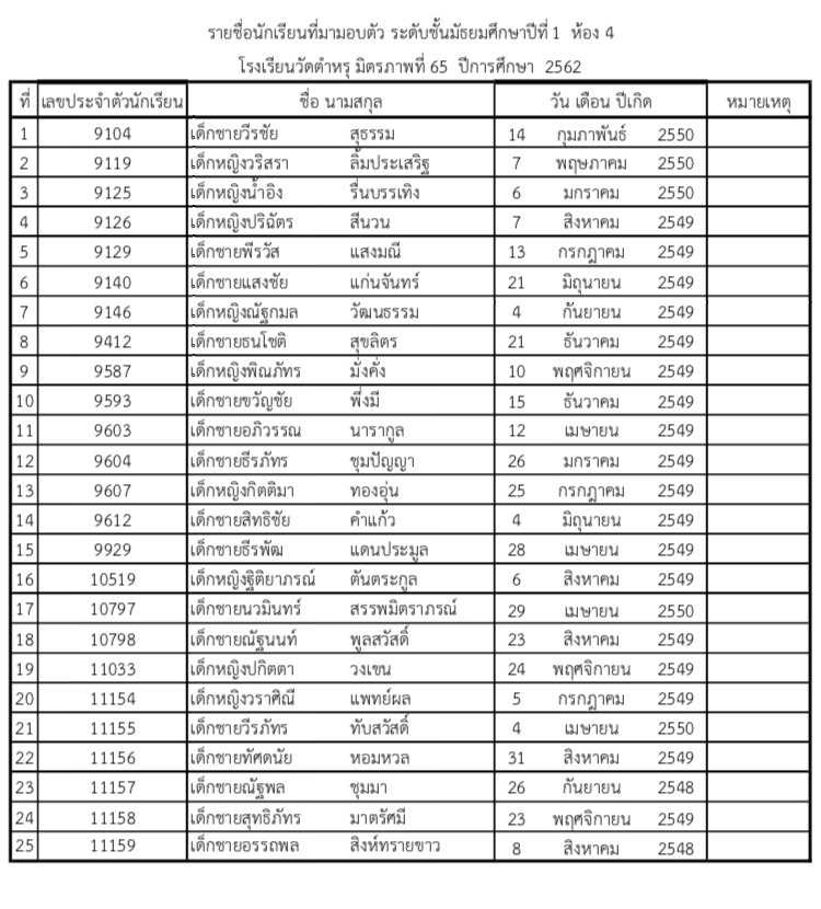 ประกาศรายชื่อนักเรียนและเลขประจำตัวนักเรียน ระดับชั้นมัธยมศึกษาปีที่ 1 ปีการศึกษา 2562