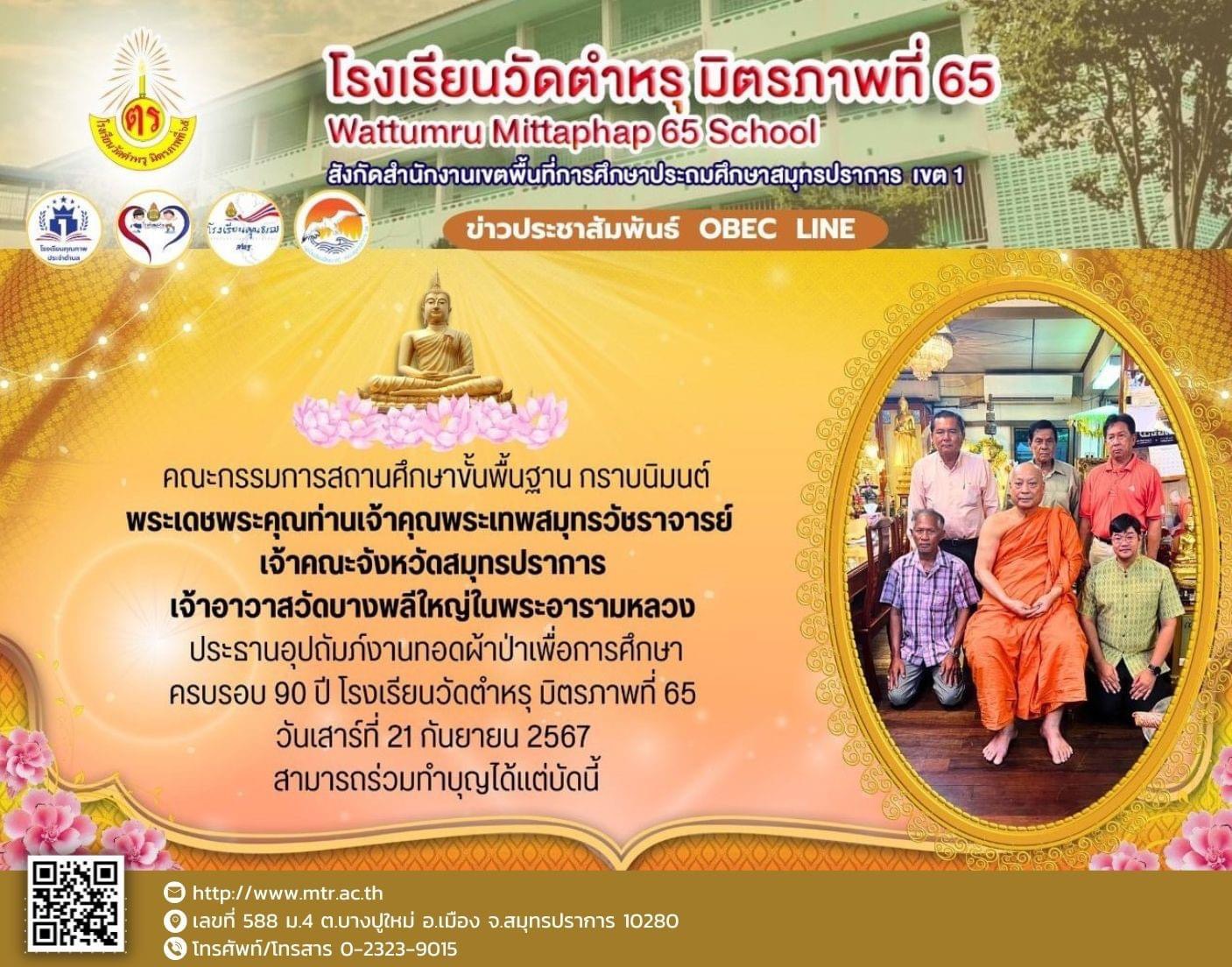 กราบนิมนต์ พระเดชพระคุณท่านเจ้าคุณพระเทพสมุทรวัชราจารย์ เจ้าคณะจังหวัดสมุทรปราการ เจ้าอาวาสวัดบางพลีใหญ่ใน พระอารามหลวง ประธานอุปถัมภ์งานทอดผ้าป่าเพื่อการศึกษาครบรอบ 90 ปี