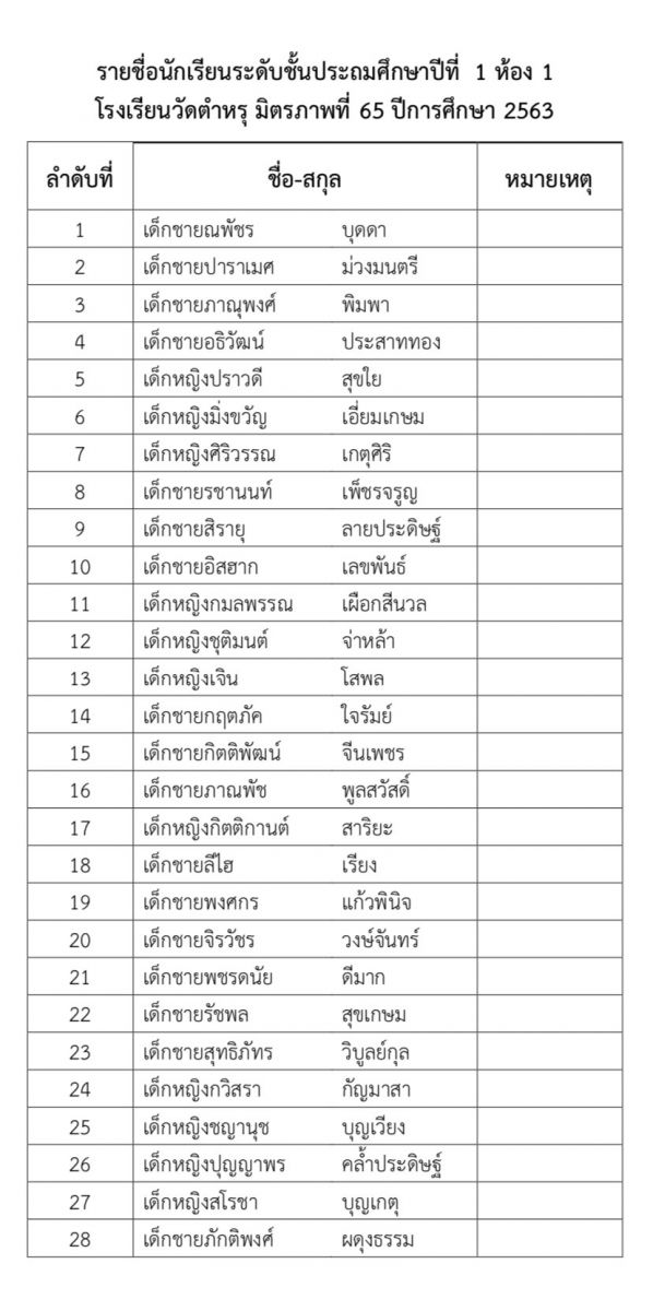 ประกาศรายชื่อนักเรียนระดับชั้นประถมศึกษาปีที่ 1 ปีการศึกษา 2563
