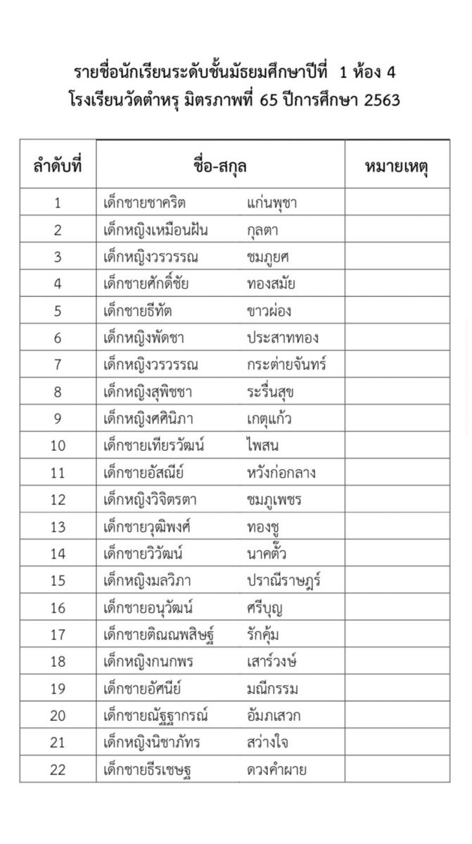ประกาศรายชื่อนักเรียนระดับชั้นมัธยมศึกษาปีที่ 1 ปีการศึกษา 2563