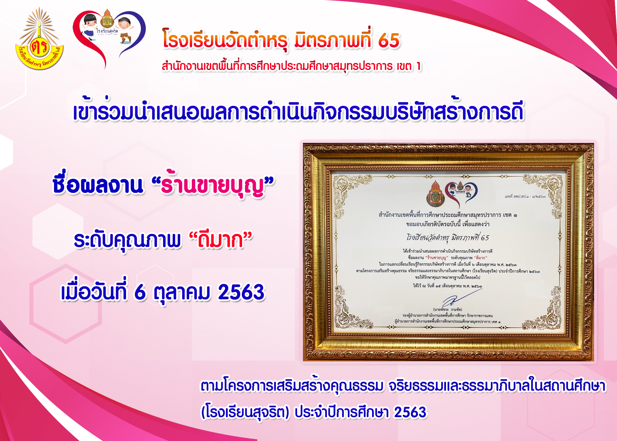การเข้าร่วมนำเสนอแลกเปลี่ยนเรียนรู้ผลการดำเนินกิจกรรมบริษัทสร้างการดี ชื่อผลงาน ร้านขายบุญ ระดับคุณภาพ ดีมาก