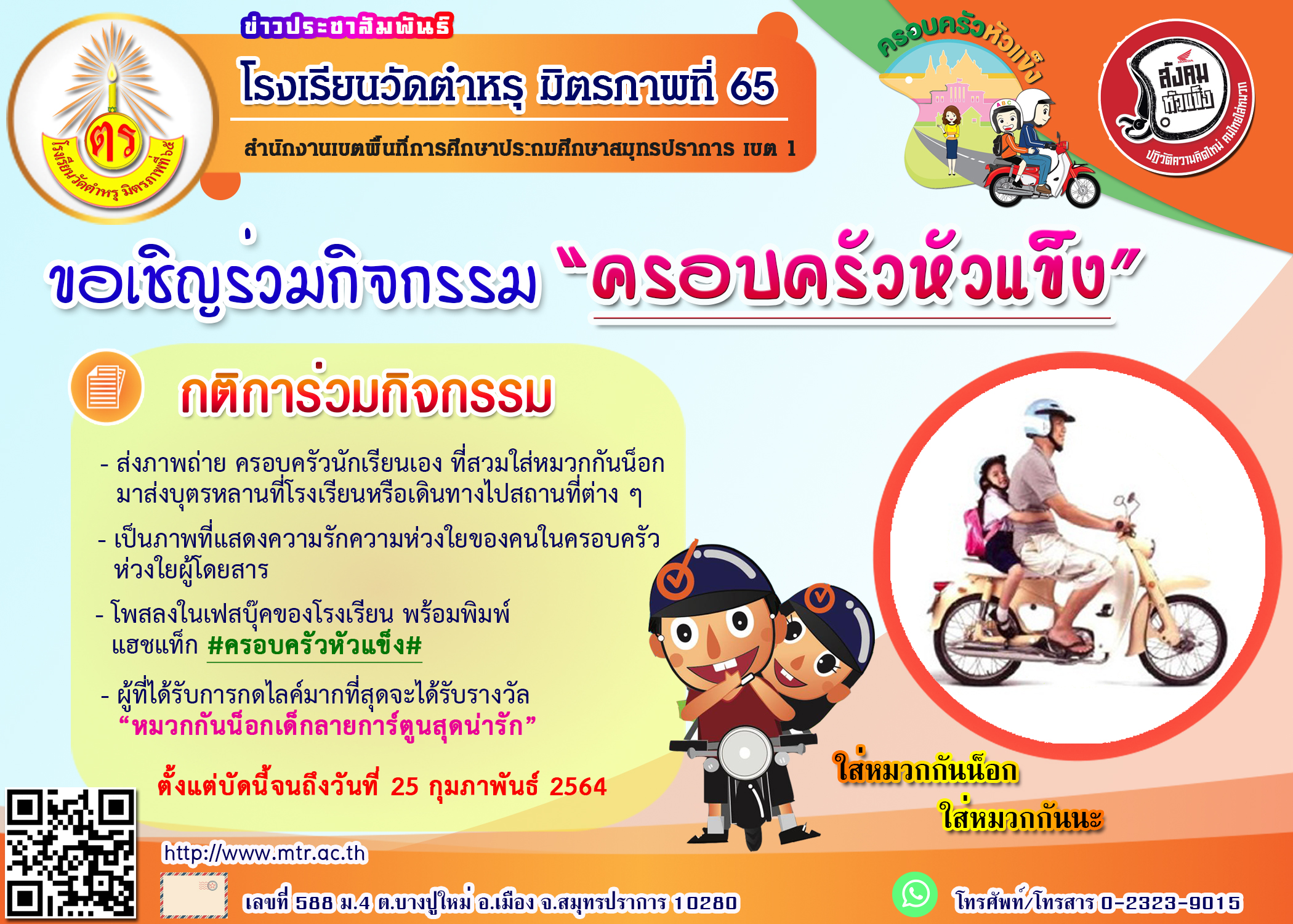 ขอเชิญผู้ปกครองและนักเรียนร่วมกิจกรรม “ครอบครัวหัวแข็ง” ร่วมส่งภาพถ่ายการใส่หมวกกันน็อกแล้วโพสลงเฟสบุ๊กของโรงเรียน พร้อมแฮชแท๊ก #ครอบครัวหัวแข็ง# ผู้ที่ได้รับการกดไลค์มากที่สุดจะได้รับรางวัล