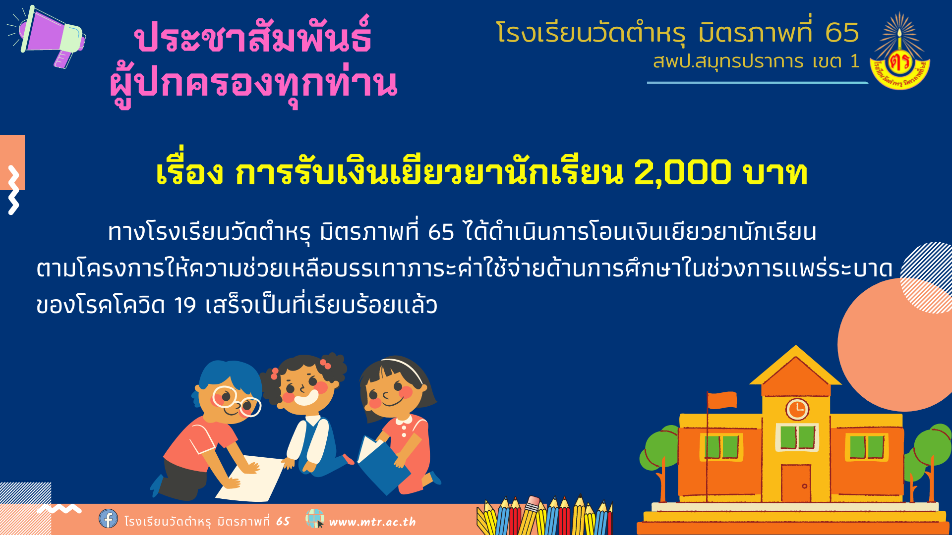 ประชาสัมพันธ์ เรื่อง การรับเงินเยียวยานักเรียนตามโครงการให้ความช่วยเหลือบรรเทาภาระค่าใช้จ่ายด้านการศึกษาในช่วงการแพร่ระบาดของโรคโควิด 19 ทางโรงเรียนได้ดำเนินการโอนเงินเสร็จเป็นที่เรียบร้อยแล้ว