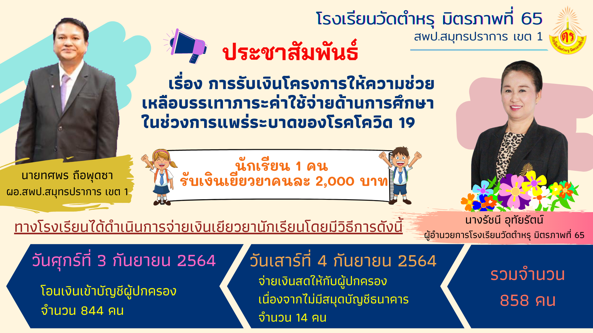 การดำเนินการรับเงินเยียวยานักเรียนตามโครงการให้ความช่วยเหลือบรรเทาภาระค่าใช้จ่ายด้านการศึกษาในช่วงการแพร่ระบาดของโรคโควิด 19 ของโรงเรียนวัดตำหรุ มิตรภาพที่ 65 รวมนักเรียนที่ได้รับเงินจำนวน 858 คน