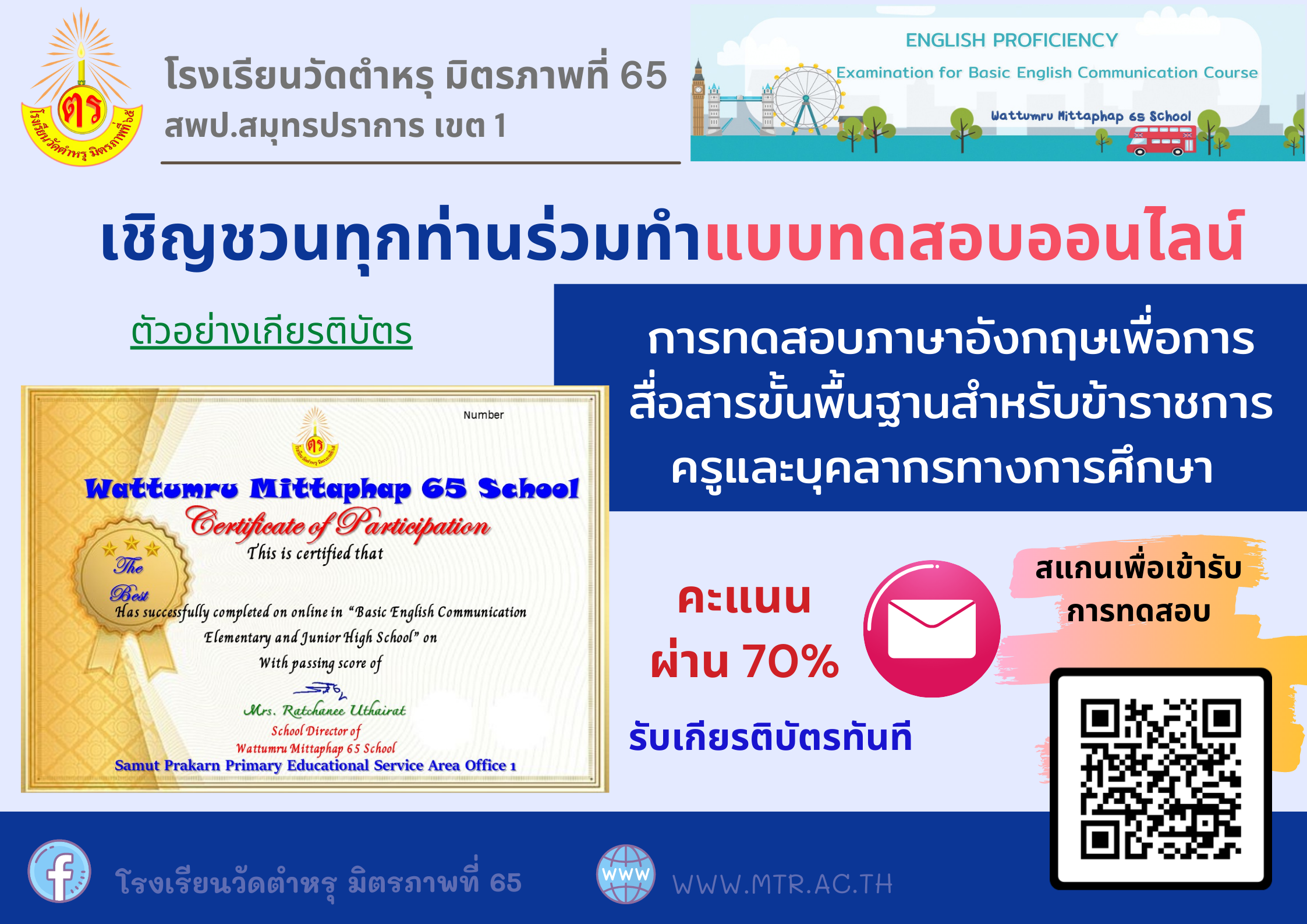ประชาสัมพันธ์โรงเรียนวัดตำหรุ มิตรภาพที่ 65 เชิญชวนทุกท่านทำแบบทดสอบผ่านระบบออนไลน์ เรื่อง การทดสอบภาษาอังกฤษเพื่อการสื่อสารขั้นพื้นฐานสำหรับข้าราชการครูและบุคลากรทางการศึกษา ผ่าน 70% รับเกียรติบัตรทันที (E-mail) โดยสามารถทำแบบทดสอบผ่านทาง