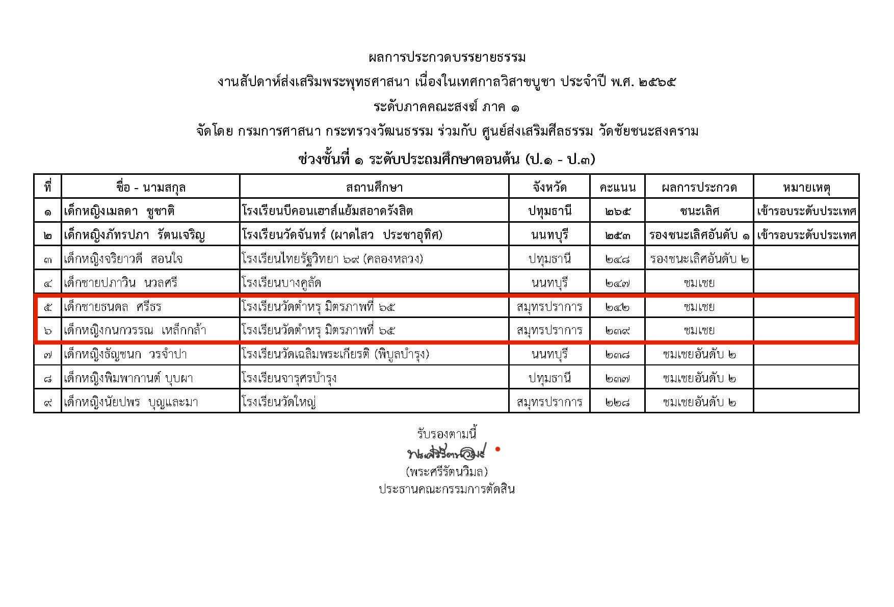 โรงเรียนวัดตำหรุ มิตรภาพที่ 65 ขอแสดงความยินดีกับ