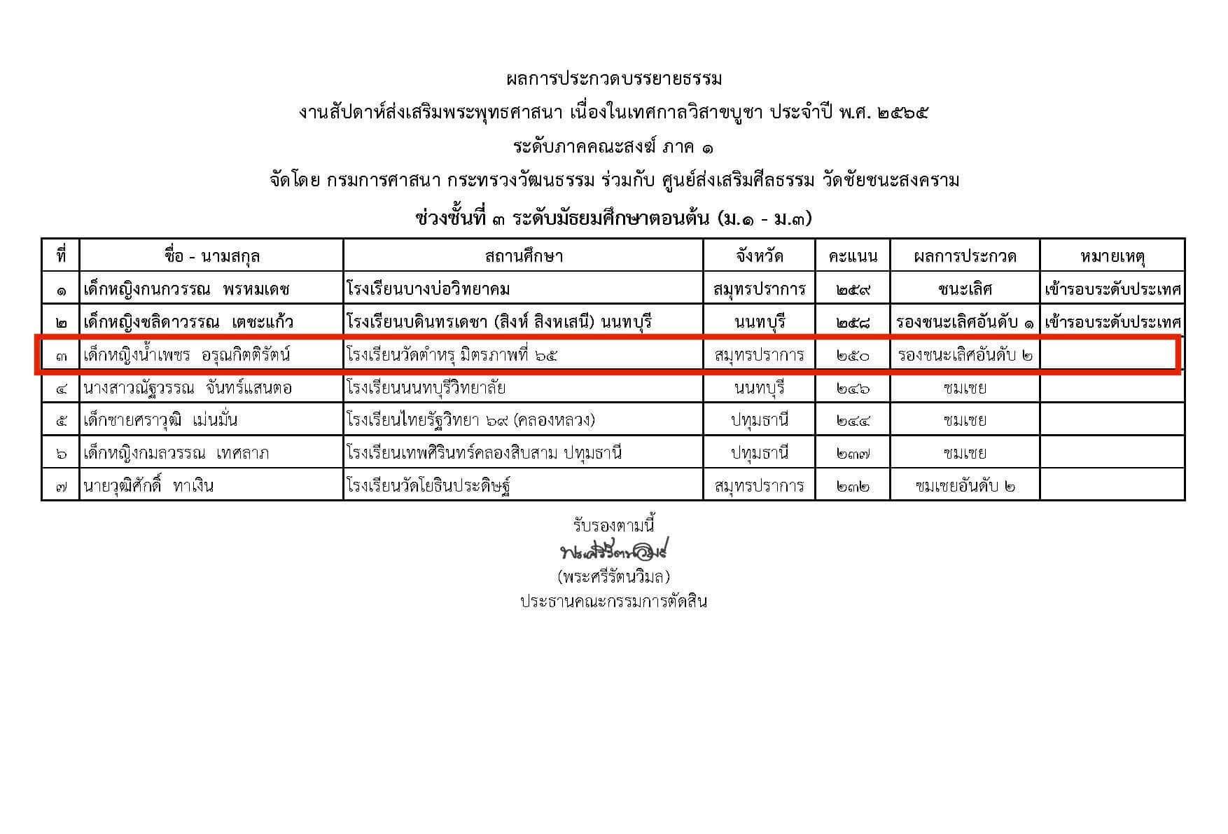 ????https://static.xx.fbcdn.net/images/emoji.php/v9/ta8/1/16/1f396.png" style="border:0px; height:16px; width:16px" />ได้รับรางวัลรองชนะเลิศอันดับ 2 การประกวดบรรยายธรรม ประจำปี พ.ศ. 2565 ระดับภาคคณะสงฆ์ ภาค 1 ช่วงชั้นที่ 3 ระดับมัธยมศึกษาตอนต้น (ม.1-3)