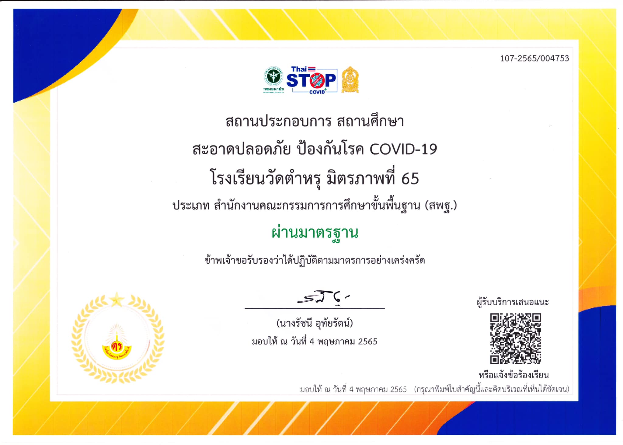 โรงเรียนวัดตำหรุ มิตรภาพที่ 65 ผ่านมาตรฐาน สถานประกอบการ สถานศึกษา สะอาดปลอดภัย ป้องกันโรค COVID-19
