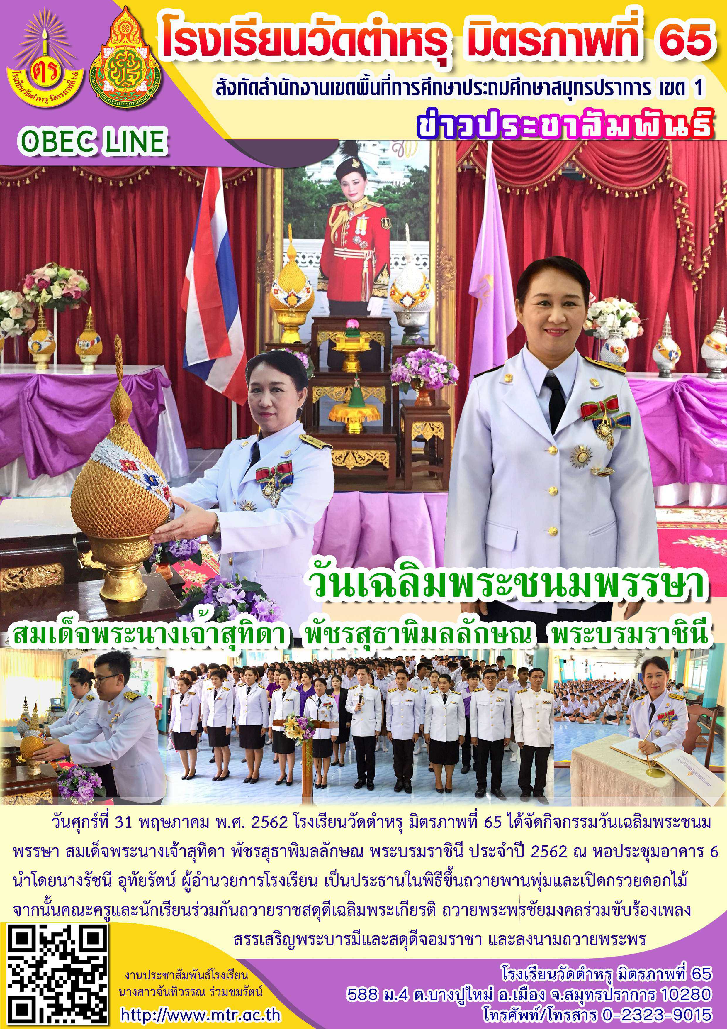 วันศุกร์ที่ 31 พฤษภาคม พ.ศ. 2562 โรงเรียนวัดตำหรุ มิตรภาพที่ 65 ได้จัดกิจกรรมวันเฉลิมพระชนมพรรษา สมเด็จพระนางเจ้าสุทิดา พัชรสุธาพิมลลักษณ พระบรมราชินี ประจำปี 2562 ณ หอประชุมอาคาร 6 นำโดยนางรัชนี อุทัยรัตน์ ผู้อำนวยการโรงเรียน เป็นประธานในพิธีขึ้นถวายพานพุ่มและเปิดกรวยดอกไม้ จากนั้นคณะครูและนักเรียนร่วมกันถวายราชสดุดีเฉลิมพระเกียรติ ถวายพระพรชัยมงคลร่วมขับร้องเพลงสรรเสริญพระบารมีและสดุดีจอมราชา และลงนามถวายพระพร