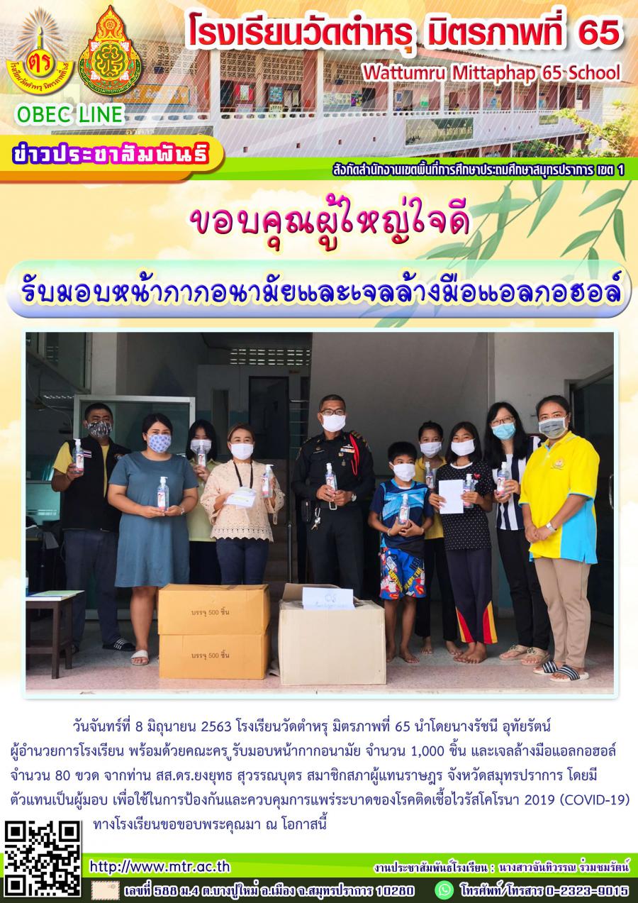 วันจันทร์ที่ 8 มิถุนายน 2563 โรงเรียนวัดตำหรุ มิตรภาพที่ 65 นำโดยนางรัชนี อุทัยรัตน์ ผู้อำนวยการโรงเรียน พร้อมด้วยคณะคร ูรับมอบหน้ากากอนามัย จำนวน 1,000 ชิ้น และเจลล้างมือแอลกอฮอล์ จำนวน 80 ขวด จากท่าน สส.ดร.ยงยุทธ สุวรรณบุตร สมาชิกสภาผู้แทนราษฎร จังหวัดสมุทรปราการ โดยมีตัวแทนเป็นผู้มอบ เพื่อใช้ในการป้องกันและควบคุมการแพร่ระบาดของโรคติดเชื้อไวรัสโคโรนา 2019 (COVID-19)  ทางโรงเรียนขอขอบพระคุณมา ณ โอกาสนี้