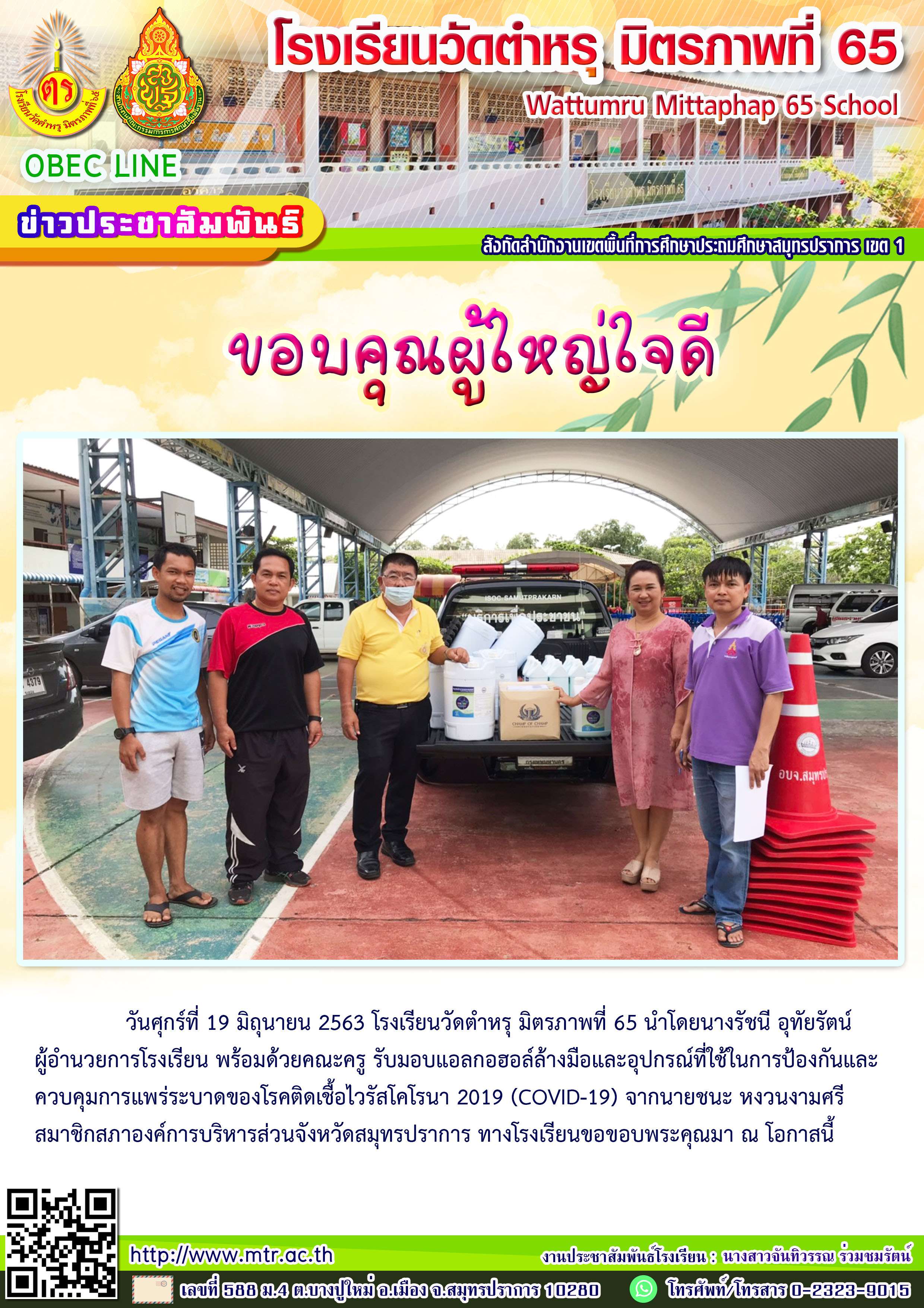 วันศุกร์ที่ 19 มิถุนายน 2563 โรงเรียนวัดตำหรุ มิตรภาพที่ 65 นำโดยนางรัชนี อุทัยรัตน์