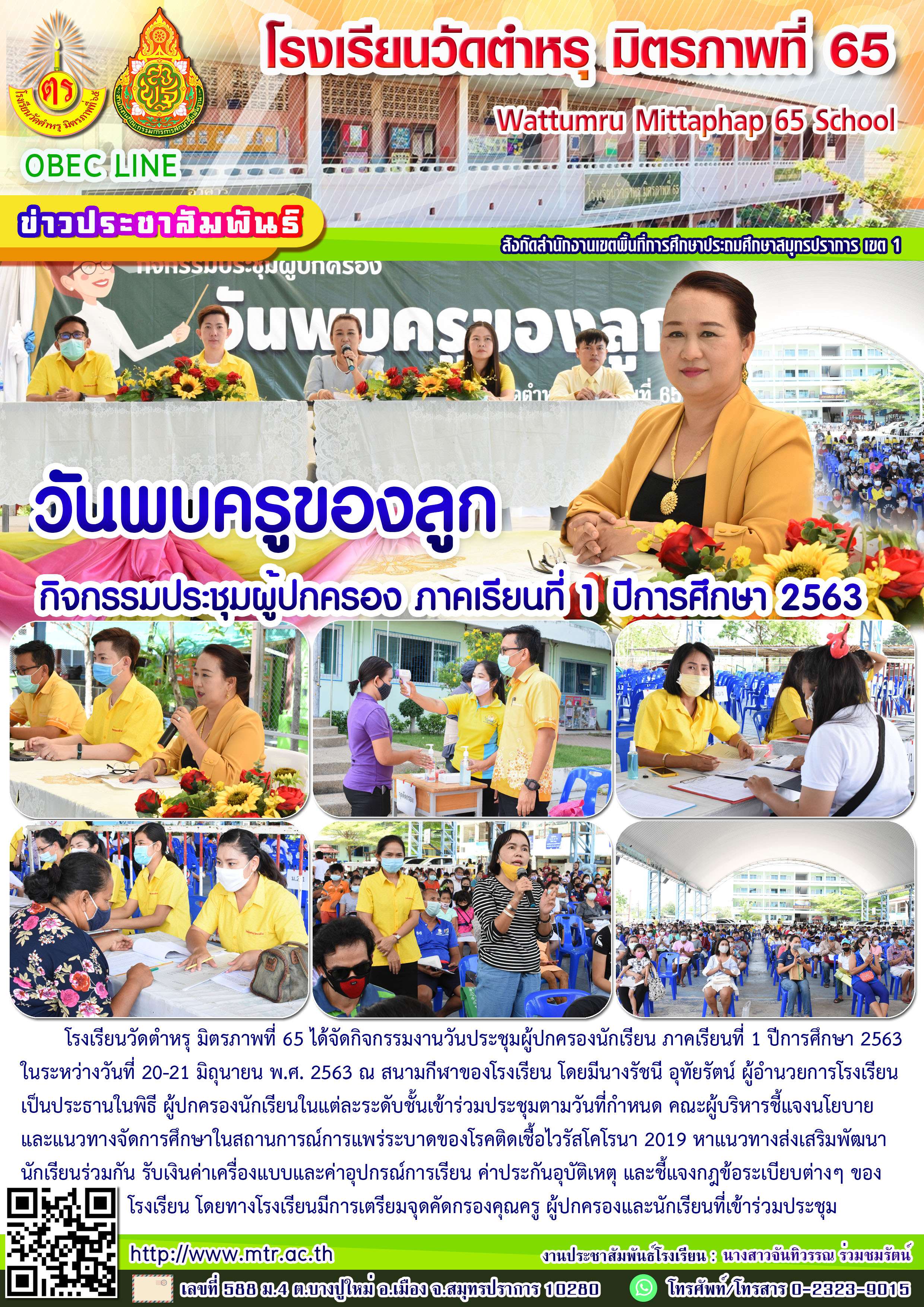โรงเรียนวัดตำหรุ มิตรภาพที่ 65 ได้จัดกิจกรรมงานวันประชุมผู้ปกครองนักเรียน ภาคเรียนที่ 1 ปีการศึกษา 2563 ในระหว่างวันที่ 20-21 มิถุนายน พ.ศ. 2563 ณ สนามกีฬาของโรงเรียน โดยมีนางรัชนี อุทัยรัตน์ ผู้อำนวยการโรงเรียน เป็นประธานในพิธี ผู้ปกครองนักเรียนในแต่ละระดับชั้นเข้าร่วมประชุมตามวันที่กำหนด คณะผู้บริหารชี้แจงนโยบายและแนวทางจัดการศึกษาในสถานการณ์การแพร่ระบาดของโรคติดเชื้อไวรัสโคโรนา 2019 หาแนวทางส่งเสริมพัฒนานักเรียนร่วมกัน รับเงินค่าเครื่องแบบและค่าอุปกรณ์การเรียน ค่าประกันอุบัติเหตุ และชี้แจงกฎข้อระเบียบต่างๆ ของโรงเรียน โดยทางโรงเรียนมีการเตรียมจุดคัดกรองคุณครู ผู้ปกครองและนักเรียนที่เข้าร่วมประชุม