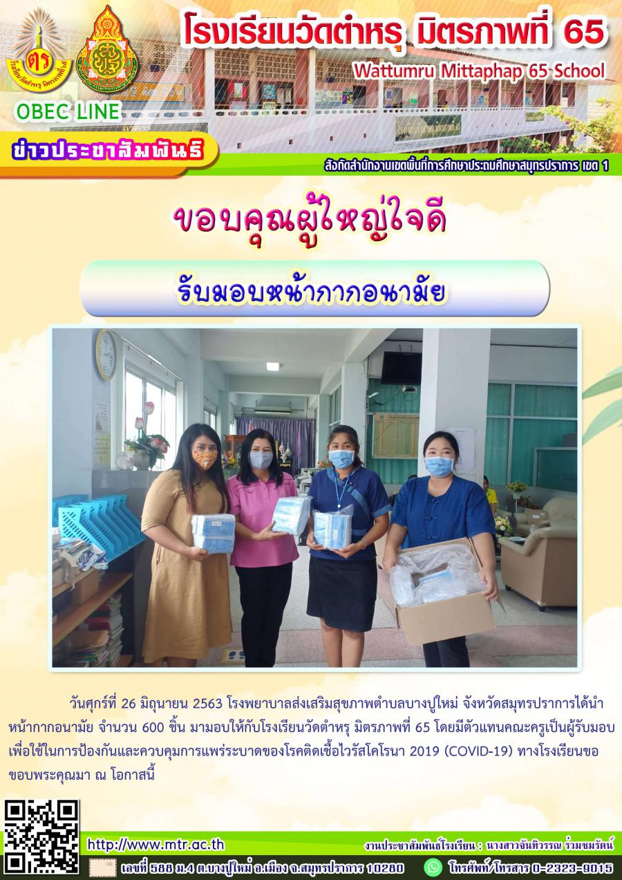 หน้ากากอนามัย จำนวน 600 ชิ้น มามอบให้กับโรงเรียนวัดตำหรุ มิตรภาพที่ 65 โดยมีตัวแทนคณะครูเป็นผู้รับมอบ