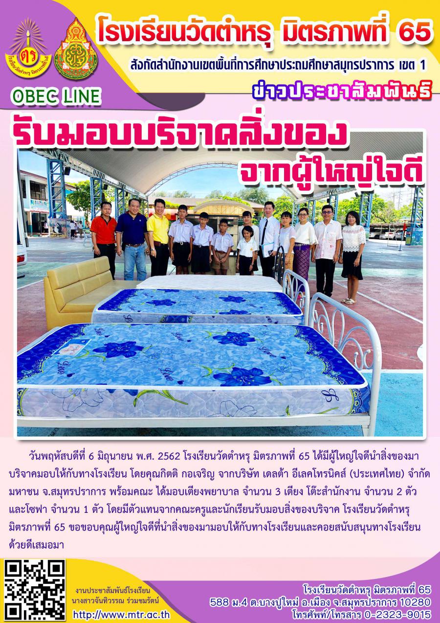 วันพฤหัสบดีที่ 6 มิถุนายน พ.ศ. 2562 โรงเรียนวัดตำหรุ มิตรภาพที่ 65 ได้มีผู้ใหญ่ใจดีนำสิ่งของมาบริจาคมอบให้กับทางโรงเรียน โดยคุณกิตติ กอเจริญ จากบริษัท เดลต้า อีเลคโทรนิคส์ (ประเทศไทย) จำกัด มหาชน จ.สมุทรปราการ พร้อมคณะ ได้มอบเตียงพยาบาล จำนวน 3 เตียง โต๊ะสำนักงาน จำนวน 2 ตัว และโซฟา จำนวน 1 ตัว โดยมีตัวแทนจากคณะครูและนักเรียนรับมอบสิ่งของบริจาค โรงเรียนวัดตำหรุ มิตรภาพที่ 65 ขอขอบคุณผู้ใหญ่ใจดีที่นำสิ่งของมามอบให้กับทางโรงเรียนและคอยสนับสนุนทางโรงเรียนด้วยดีเสมอมา