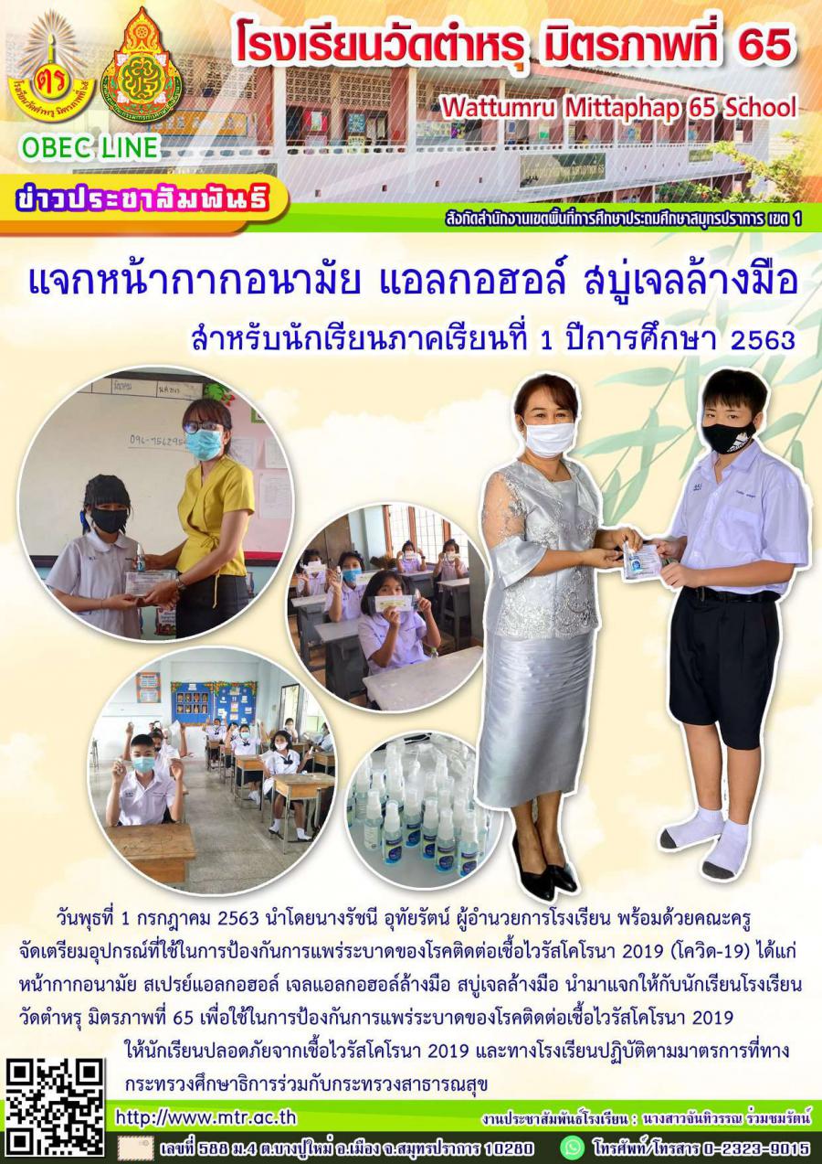 วันพุธที่ 1 กรกฎาคม 2563 นำโดยนางรัชนี อุทัยรัตน์ ผู้อำนวยการโรงเรียน พร้อมด้วยคณะครูจัดเตรียมอุปกรณ์ที่ใช้ในการป้องกันการแพร่ระบาดของโรคติดต่อเชื้อไวรัสโคโรนา 2019 (โควิด-19) ได้แก่ หน้ากากอนามัย สเปรย์แอลกอฮอล์ เจลแอลกอฮอล์ล้างมือ สบู่เจลล้างมือ นำมาแจกให้กับนักเรียนโรงเรียนวัดตำหรุ มิตรภาพที่ 65 เพื่อใช้ในการป้องกันการแพร่ระบาดของโรคติดต่อเชื้อไวรัสโคโรนา 2019 ให้นักเรียนปลอดภัยจากเชื้อไวรัสโคโรนา 2019 และทางโรงเรียนปฏิบัติตามมาตรการที่ทางกระทรวงศึกษาธิการร่วมกับกระทรวงสาธารณสุข