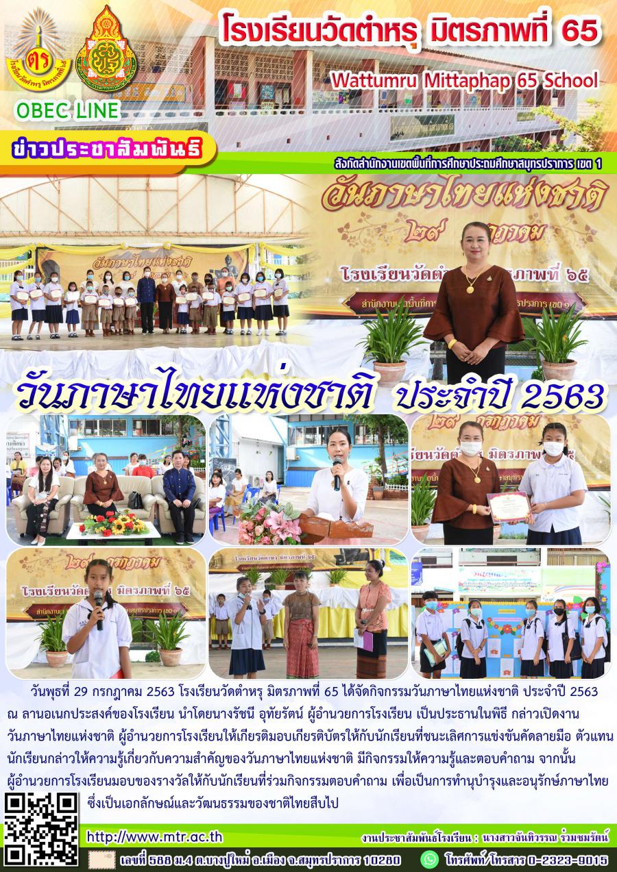 วันพุธที่ 29 กรกฎาคม 2563 โรงเรียนวัดตำหรุ มิตรภาพที่ 65 ได้จัดกิจกรรมวันภาษาไทยแห่งชาติ ประจำปี 2563 ณ ลานอเนกประสงค์ของโรงเรียน นำโดยนางรัชนี อุทัยรัตน์ ผู้อำนวยการโรงเรียน เป็นประธานในพิธี กล่าวเปิดงานวันภาษาไทยแห่งชาติ ผู้อำนวยการโรงเรียนให้เกียรติมอบเกียรติบัตรให้กับนักเรียนที่ชนะเลิศการแข่งขันคัดลายมือ ตัวแทนนักเรียนกล่าวให้ความรู้เกี่ยวกับความสำคัญของวันภาษาไทยแห่งชาติ มีกิจกรรมให้ความรู้และตอบคำถาม จากนั้นผู้อำนวยการโรงเรียนมอบของรางวัลให้กับนักเรียนที่ร่วมกิจกรรมตอบคำถาม เพื่อเป็นการทำนุบำรุงและอนุรักษ์ภาษาไทย ซึ่งเป็นเอกลักษณ์และวัฒนธรรมของชาติไทยสืบไป