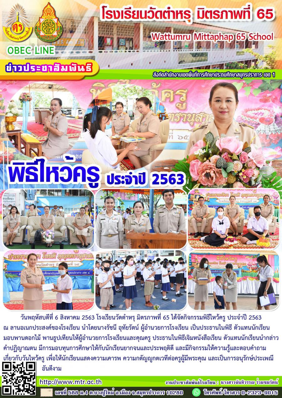 วันพฤหัสบดีที่ 6 สิงหาคม 2563 โรงเรียนวัดตำหรุ มิตรภาพที่ 65 ได้จัดกิจกรรมพิธีไหว้ครู ประจำปี 2563 ณ ลานอเนกประสงค์ของโรงเรียน นำโดยนางรัชนี อุทัยรัตน์ ผู้อำนวยการโรงเรียน เป็นประธานในพิธี ตัวแทนนักเรียนมอบพานดอกไม้ พานธูปเทียนให้ผู้อำนวยการโรงเรียนและคุณครู ประธานในพิธีเจิมหนังสือเรียน ตัวแทนนักเรียนนำกล่าวคำปฏิญาณตน มีการมอบทุนการศึกษาให้กับนักเรียนยากจนและประพฤติดี และมีกิจกรรมให้ความรู้และตอบคำถามเกี่ยวกับวันไหว้ครู เพื่อให้นักเรียนแสดงความเคารพ ความกตัญญูกตเวทีต่อครูผู้มีพระคุณ และเป็นการอนุรักษ์ประเพณี อันดีงาม