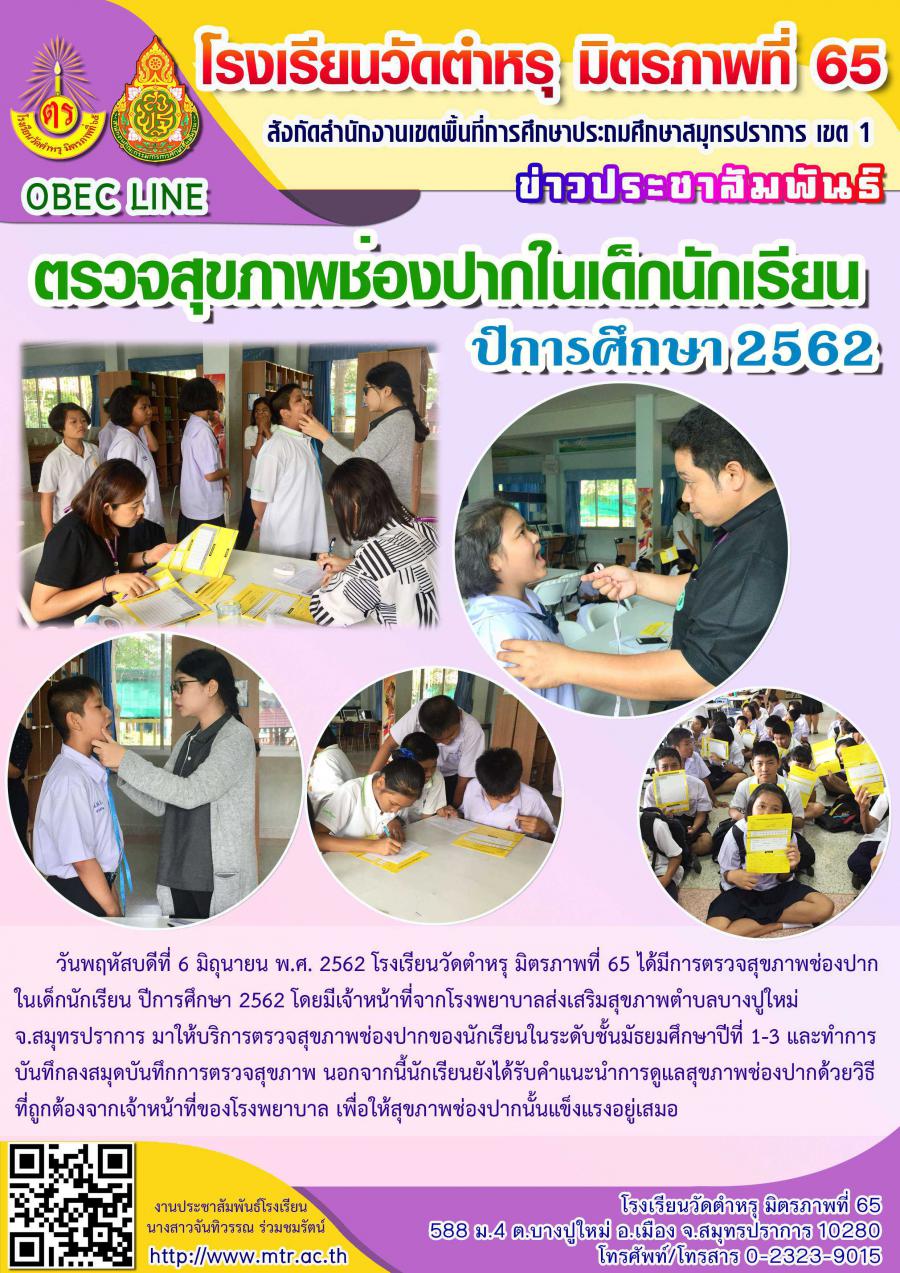 วันพฤหัสบดีที่ 6 มิถุนายน พ.ศ. 2562 โรงเรียนวัดตำหรุ มิตรภาพที่ 65 ได้มีการตรวจสุขภาพช่องปากในเด็กนักเรียน ปีการศึกษา 2562 โดยมีเจ้าหน้าที่จากโรงพยาบาลส่งเสริมสุขภาพตำบลบางปูใหม่ จ.สมุทรปราการ มาให้บริการตรวจสุขภาพช่องปากของนักเรียนในระดับชั้นมัธยมศึกษาปีที่ 1-3 และทำการบันทึกลงสมุดบันทึกการตรวจสุขภาพ นอกจากนี้นักเรียนยังได้รับคำแนะนำการดูแลสุขภาพช่องปากด้วยวิธีที่ถูกต้องจากเจ้าหน้าที่ของโรงพยาบาล เพื่อให้สุขภาพช่องปากนั้นแข็งแรงอยู่เสมอ