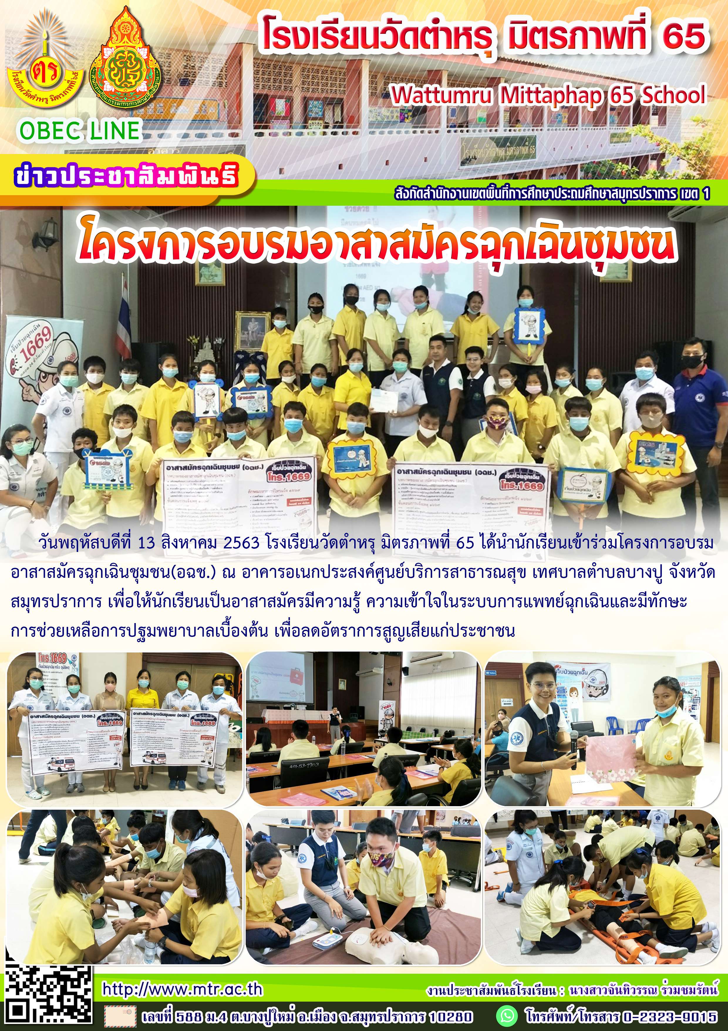 วันพฤหัสบดีที่ 13 สิงหาคม 2563 โรงเรียนวัดตำหรุ มิตรภาพที่ 65 ได้นำนักเรียนเข้าร่วมโครงการอบรมอาสาสมัครฉุกเฉินชุมชน(อฉช.) ณ อาคารอเนกประสงค์ศูนย์บริการสาธารณสุข เทศบาลตำบลบางปู จังหวัดสมุทรปราการ เพื่อให้นักเรียนเป็นอาสาสมัครมีความรู้ ความเข้าใจในระบบการแพทย์ฉุกเฉินและมีทักษะการช่วยเหลือการปฐมพยาบาลเบื้องต้น เพื่อลดอัตราการสูญเสียแก่ประชาชน