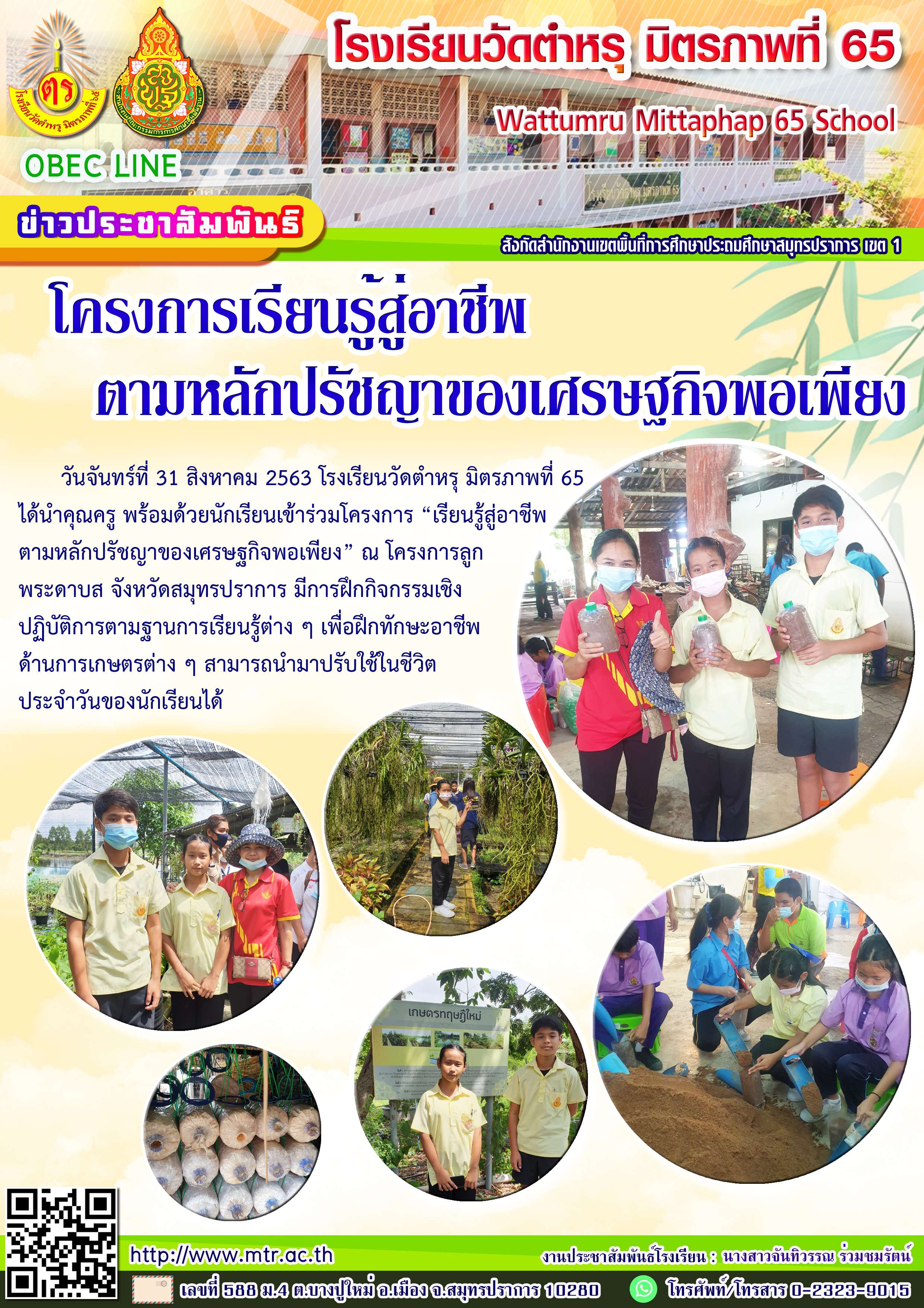 วันจันทร์ที่ 31 สิงหาคม 2563 โรงเรียนวัดตำหรุ มิตรภาพที่ 65 ได้นำคุณครู พร้อมด้วยนักเรียนเข้าร่วมโครงการ “เรียนรู้สู่อาชีพ ตามหลักปรัชญาของเศรษฐกิจพอเพียง” ณ โครงการลูกพระดาบส จังหวัดสมุทรปราการ มีการฝึกกิจกรรมเชิง