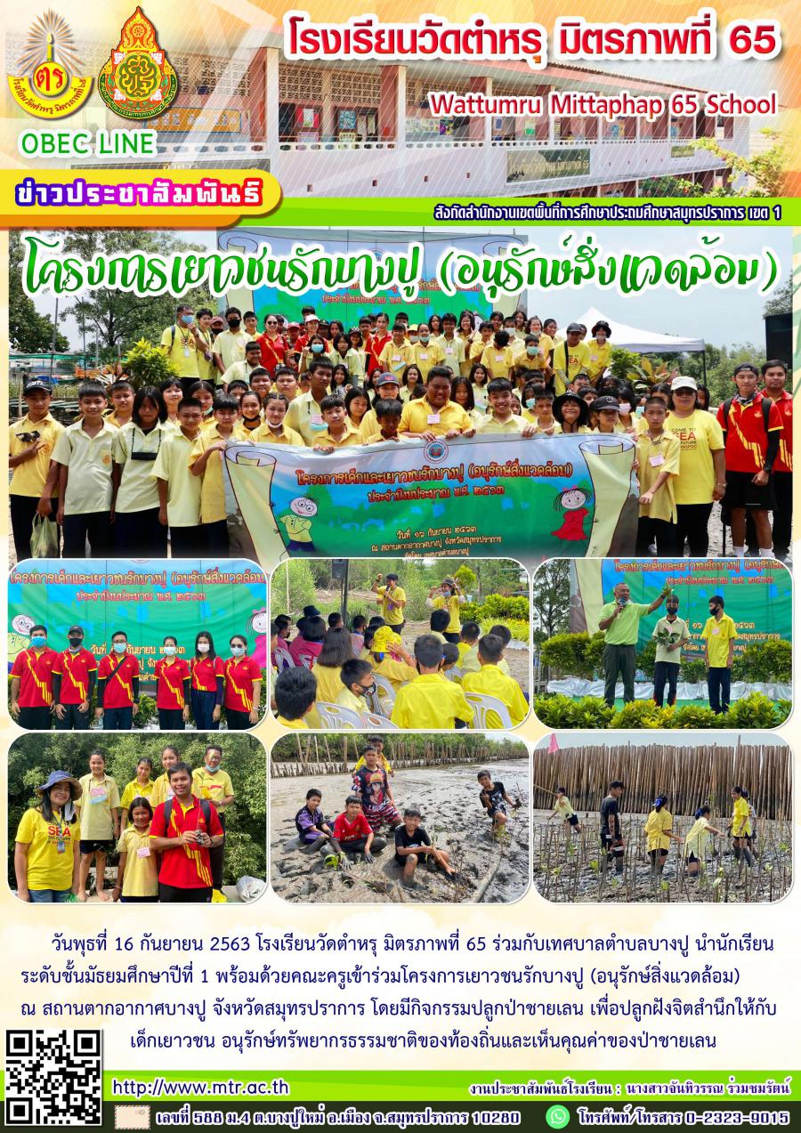 วันพุธที่ 16 กันยายน 2563 โรงเรียนวัดตำหรุ มิตรภาพที่ 65 ร่วมกับเทศบาลตำบลบางปู นำนักเรียนระดับชั้นมัธยมศึกษาปีที่ 1 พร้อมด้วยคณะครูเข้าร่วมโครงการเยาวชนรักบางปู(อนุรักษ์สิ่งแวดล้อม) ณ สถานตากอากาศบางปู จังหวัดสมุทรปราการ โดยมีกิจกรรมปลูกป่าชายเลน เพื่อปลูกฝังจิตสำนึกให้กับเด็ก เยาวชน อนุรักษ์รัพยากรธรรมชาติของท้องถิ่นและเห็นคุณค่าของป่าชายเลน